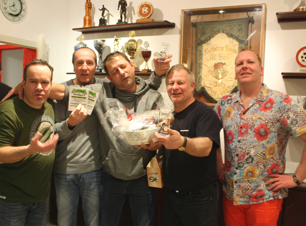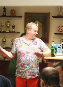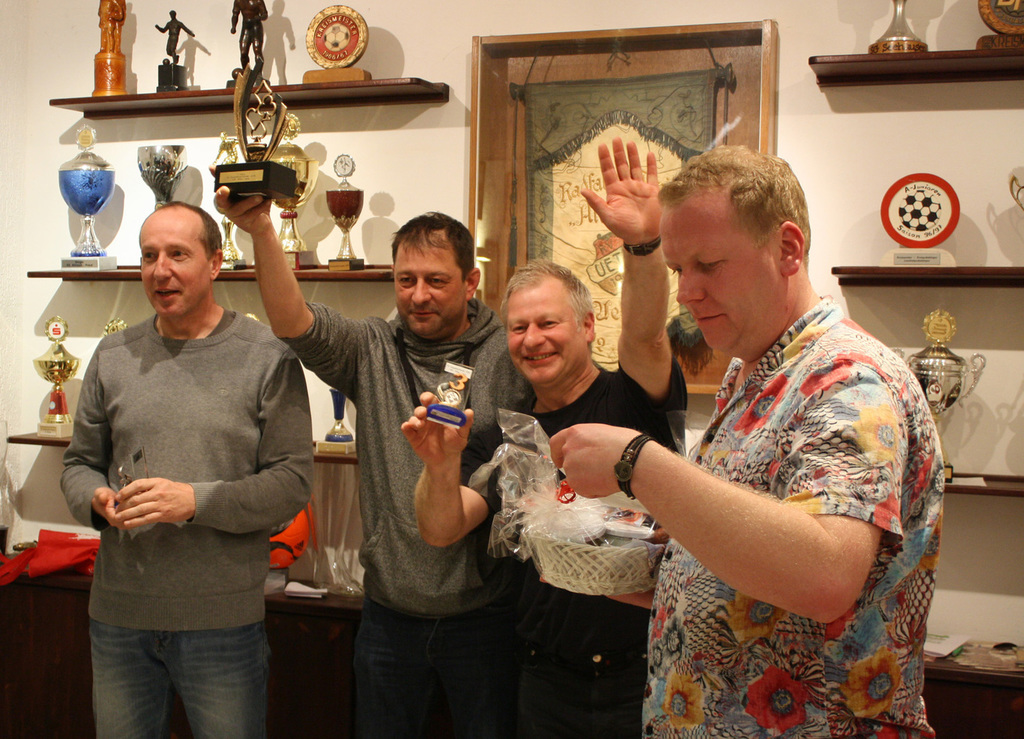Etwa vier Stunden später war nach zwei sehr intensiven Runden (36 Spiele) der letzte Stich gemacht. Bevor es jedoch zur mit Spannung erwarteten Siegerehrung kam, nutzte der Vereinsvorsitzende Marco Lust die Möglichkeit und bedankte sich bei den Organisatoren Stephan Heinert und Christian Lust für ihre Arbeit bei der Vorbereitung und Durchführung der beliebten Kartenabende. Danach übernahm Stephan Heinert das Kommando. Aber bevor der Hauptschiedsrichter die Sieger des Abends verkündete, gab er noch eine ganze Reihe an Statistiken und Fakten zu den zurückliegenden zehn Doppelkopfturnieren zum Besten. Danach nannte er unter dem großen Beifall der Anwesenden die einzelnen Platzierungen.