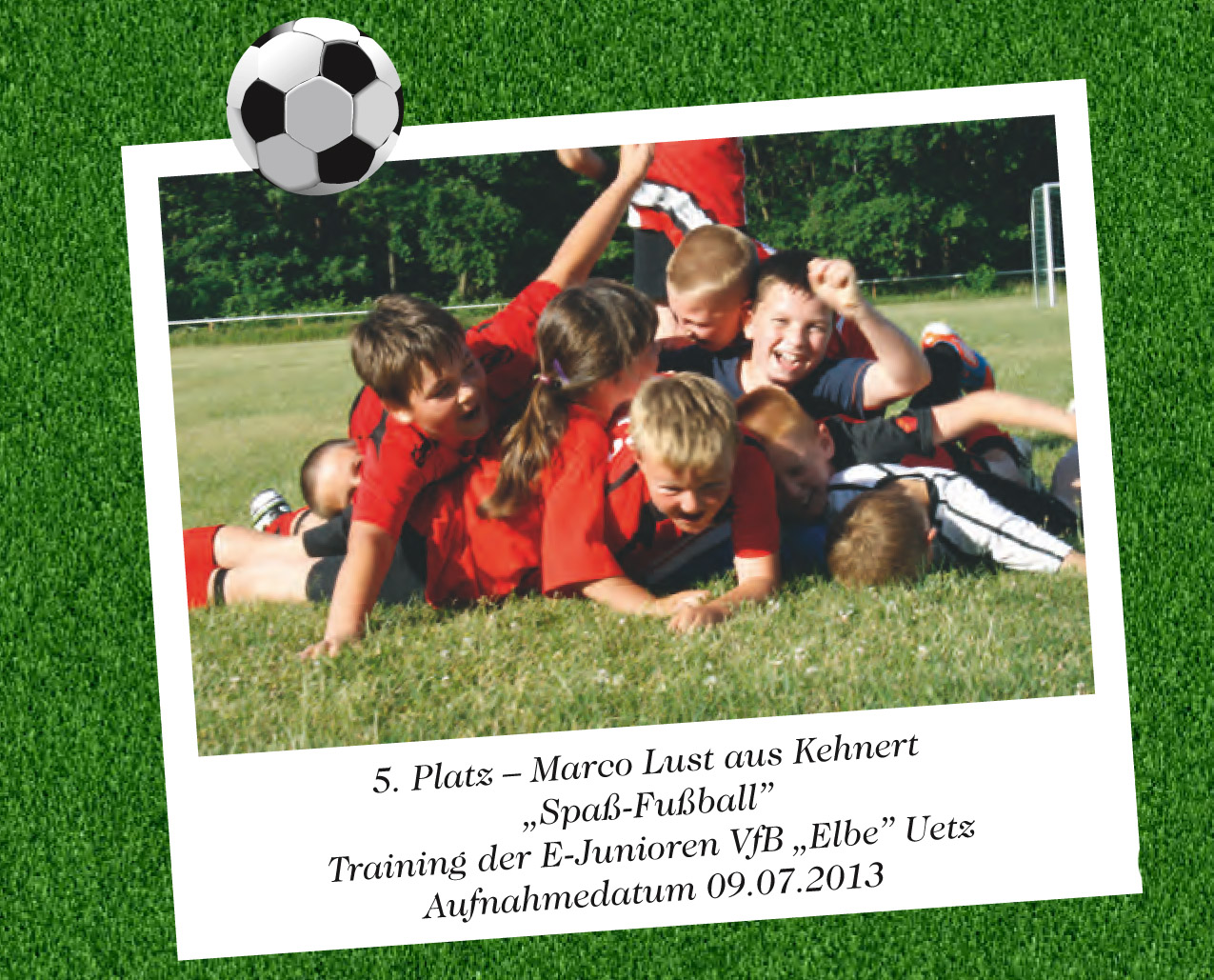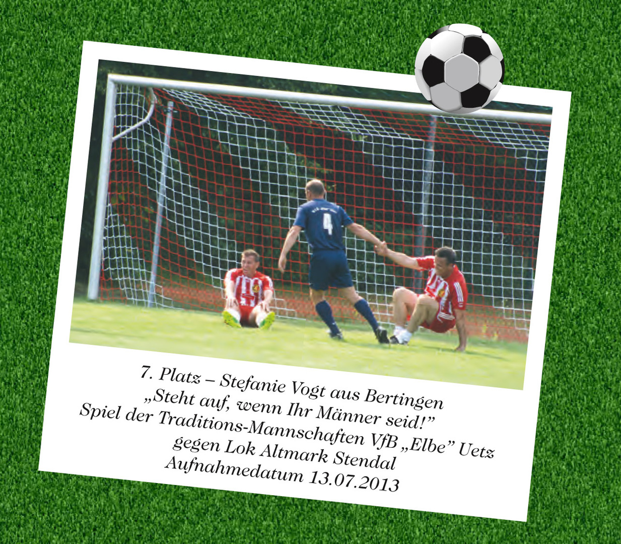 Mit in der Verlosung waren dieses Mal auch zwei Beiträge unseres VfB. Und das mit großem Erfolg. Stefanie Vogt aus Bertingen landete mit ihrem Foto „Steht auf, wenn ihr Männer seid!“ auf Platz 7. Sie hatte eine faire Szene aus dem Spiel der VfB-Traditionsmannschaft gegen die Auswahl von Lok Stendal aufgenommen und eingesandt. Das Foto „Spaßfußball“ von Marco Lust schaffte es sogar auf Rang 5. Sein Schnappschuss zeigte eine Jubelszene aus dem Training unserer E-Junioren.
