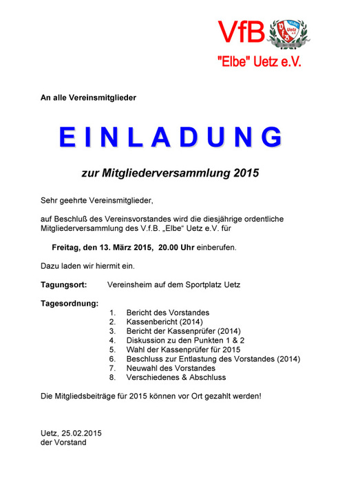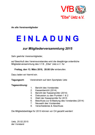 Der Vorstand des VfB „Elbe“ Uetz lädt alle Vereinsmitglieder für Freitag den 13. März zur jährlichen Mitgliederversammlung ein.
