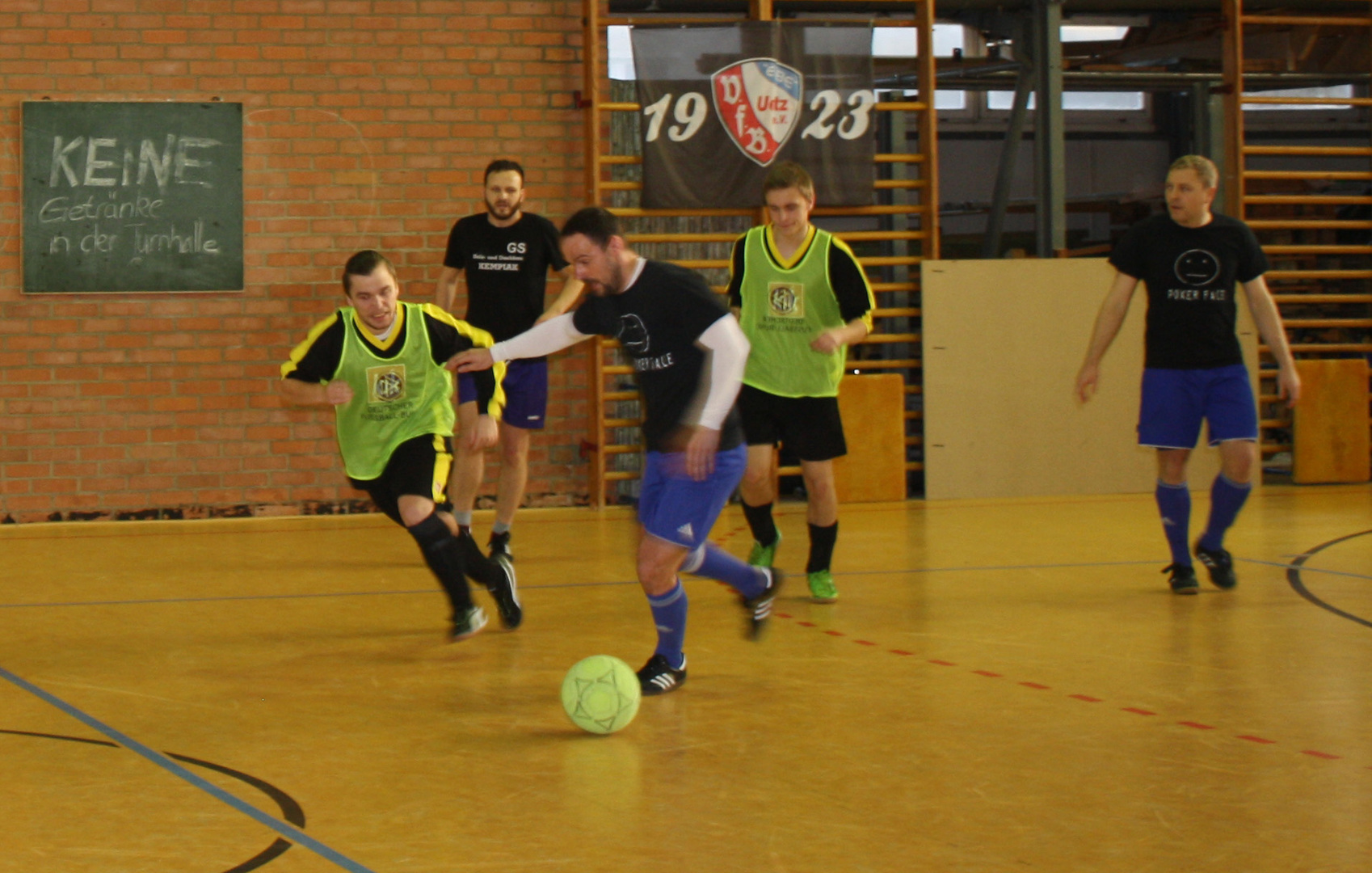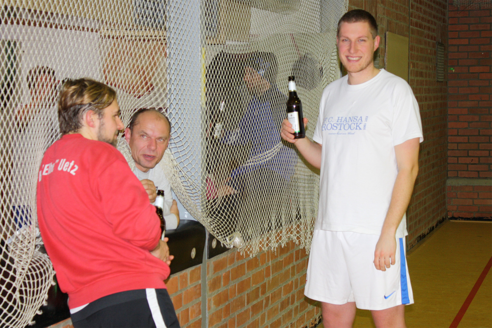 Insgesamt lieferten sich gleich 9 Freizeit-Mannschaften aus Uetz und den umliegenden Ortschaften spannende Spiele beim beliebten Fußballturnier zum Jahresauftakt. Positive Überraschung des Turniers war die Mannschaft aus Buch. Bei ihrer ersten Teilnahme zeigten die jungen Kicker tollen Hallenfußball und sorgten mit einem 4:1-Sieg gegen Rudi´s Team für Spannung in der Gruppe A. Das es am Ende trotzdem nicht fürs Halbfinale reichte, lag auch an der tollen Moral der Jungs von der Bautischlerei Heinert. Obwohl für die Bertinger das Vorrundenaus bereits feststand, erkämpften sie sich im letzten Gruppenspiel ein 2:2 gegen Buch. Dieses Ergebnis bedeutete das Aus für die Bucher und den Halbfinaleinzug für Rudi´s Team.
