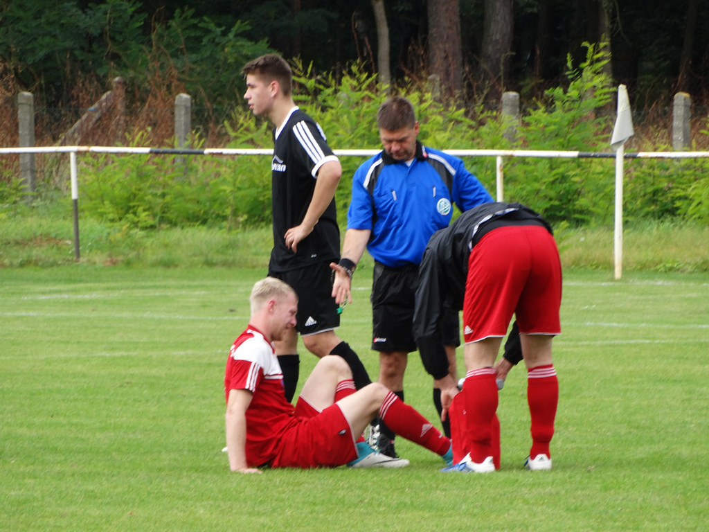 10 Minuten vor dem Pausenpfiff fiel dann aus dem Nichts die Führung für die Hausherren. Luis Motejat hatte aus der zweiten Reihe abgezogen. Nigel Kempchen rutschte weg und konnte das Leder nur noch nach vorn abwehren, Erik Bartsch war zur Stelle und staubte ab (35.). Der VfB antwortete mit mehreren langen Bällen und kam kurz vor der Halbzeit dem Ausgleich sehr nah. Robert Bolle schüttelte gleich mehrere Gegenspieler ab, umkurvte den Torhüter und hatte nur noch das leere Tor vor sich, als in SG-Keeper Kanneberg plump von den Beinen holte. Glasklarer Elfmeter, auch ohne Viedeo-Schiedsrichter deutlich zu sehen! Dachten alle. Nur der Pfiff blieb aus. Auch alle Proteste halfen nicht, Schiri Bock hatte die Szene genau gesehen und auf Weiterspielen entschieden.