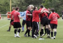 Zwar war der Diver vor dem Fanblock noch mangelhaft aber spätestens ab der Laola-Welle war alles wieder aufstiegswürdig. Christian Lust, mit drei Treffern der Mann des Spiels, gab den Einheizer mit Fan-Megafon und im Fanblock wurden die letzte Böller und Soundraketen gezündet. Als dann endlich alle Spieler die extra angefertigten Aufstiegsshirts übergezogen hatten, wurde es noch einmal kurz offiziell. Die Presse hatte zum Mannschaftsfoto gebeten. Also stillgestanden, Brust raus und einmal „Käsekuchen“ gerufen. Danach ging es aber weiter mit den üblichen Party-Ritualen.