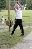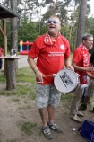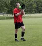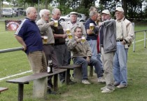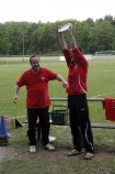 So drehten unsere Torhüter mit umgehängter VfB-Fahne eine Ehrenrunde, der Libero genoss seine Flitzer-Einlage und besonders „beliebte“ Teamkameraden fielen noch der einen oder anderen Bierdusche zum Opfer. Ihren eigenen Beitrag zur Partiestimmung brachten die „etwas älteren“ Uetzer Herren, zufrieden mit der Fußballwelt schmetterten sie lautstark alte Fußballlieder und feierten ihren VfB. Für den letzten offiziellen Tagesordnungspunkt unterbrach dann Marco Lust noch einmal die Feierlichkeiten. Danksagungen und Ehrungen standen auf dem Programm. Und der Trainer wusste genau bei wem er sich zu bedanken hatte. Doch zunächst stürmte noch einmal der Kapitän die Bühne und präsentierte unter dem Jubel der Mannschaft eine kurzerhand zur Aufstiegstrophäe umgewandelte Meisterschale. Der erste Dank ging dann an Siegfried Engelhardt, der sich als gute Seele des Vereins auch in dieser Saison um Eintrittskasse, Sportplatzschlüssel, Trainingsbälle und –Leibchen kümmerte. Weitere Danksagungen wurden an Eintrittskassierer „Kitti“ und die Mädels vom Verkaufsstand verteilt. Selbstverständlich hatte der Coach auch an die Fans gedacht und bedankte sich stellvertretend bei Martin Hamel für die tolle Unterstützung bei Heim- und Auswärtsspielen.