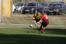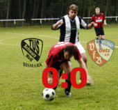 Mit leicht veränderter Startelf, Christian Lust und Stefan Schubert begannen für Robert Bolle und Tobias Mielke, wollten unsere Jungs an die gute Leistung aus dem Pokalspiel anknüpfen. In der Anfangsphase hatte unsere Mann-schaft auch mehr vom Spiel, jedoch ohne nennenswerte Tor-chancen. Die Gastgeber begannen vorsichtig und beschränkten sich zunächst auf eine solide Abwehrarbeit. Torgefahr deuteten die Bismarker nur bei Kontern oder Standardsituationen an. Unser Team bemühte sich zwar das Spiel zu kontrollieren, rannte sich aber immer wieder an der TuS Defensive fest. Einzig zwei Fernschüsse von Ronny Pfeiffer und David Mielke sorgten für etwas Aufregung. Die junge TuS-Elf antwortete mit Standards. Erst hatte Maik Schulze im VfB-Tor bei einem flachen Freistoß leichte Probleme, dann kam Steffen Richen nach einem Eckball gefährlich zum Kopfball. Es entwickelte sich eine ausgeglichene Partie ohne spielerische Glanz-punkte. Die Gastgeber spielten weiterhin taktisch diszipliniert und mit sehr hohem Kraftaufwand. Unsere Mannschaft war spielerisch leicht überlegen, im Spiel nach vorn fehlten jedoch Schnelligkeit und Präzision. Nur selten gelangen Kombinationen über mehrere Stationen, wie in der 25. Spielminute. Christian Lust setzte sich an der linken Strafraumkante durch und passte quer auf Michael Woop, dessen Schuss strich aber knapp am rechten Pfosten vorbei. Die größte VfB-Chance hatte dann Ronny Pfeiffer der mit seinem Dis-tanzschuss an der Torlatte scheiterte (28. Minute). Kurz vor der Pause kamen dann auch die Gastgeber zu einer Großchance. Stefan Schubert rutsche bei einem TuS-Konter unglücklich aus und plötzlich hatte Steffen Riechen freie Bahn, aber Maik Schulze verhinderte mit einer tollen Parade das Gegentor.