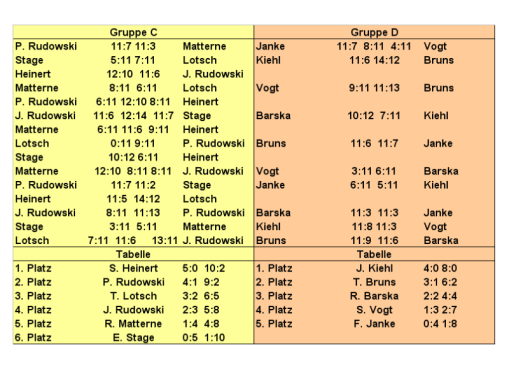 Begeistert zeigte sich auch Ortsbürgermeister Jörg Rudowski: „Es war heute einfach mal ein Versuch. 21 Sportfreunde sind hier – das ist doch schon ein guter Anfang.“ Sportlich lief es für den Uetzer nicht so gut, im Achtelfinale unterlag er Stefan Schmilas glatt mit 0:4 Sätzen. Hier war dann auch für die letzten weiblichen Teilnehmer Endstation. Jana Burkhardt aus Kehnert, Ivonne Theuerkauf und Stefanie Vogt aus Bertingen hatten immerhin die Gruppenphase überstanden, blieben im Achtelfinale aber chancenlos. Ab hier hatten die Fußballer dann das Turnier fest im Griff. Lediglich dem Kehnerter Silvio Geue gelang der Sprung ins Halbfinale. Gegen den Turnierfavoriten Ronny Barska setze es dort aber eine deutliche 0:4-Niederlage. Im zweiten Semifinale musste sich dann auch Organisator Stephan Heinert geschlagen geben. Nachdem er sich im Viertelfinale noch mit 4:2 gegen Jens Ruhnke behaupten konnte, unterlag er Jörn Kiehl glatt mit 0:4. Damit zog der ehemalige VfB-Libero ohne Satzverlust ins Finale ein und war hier gegen den Kehnerter Ronny Barska in der Favoritenrolle. Und das Finale hatte es in sich. Vor rund 30 Zuschauern schenkten sich beide Rivalen nichts und boten attraktives Tischtennis. Nach fünf abgewehrten Satzbällen ging Jörn erwartungsgemäß in Führung. Ronny konnte zwar noch einmal ausgleichen, aber an diesem Tag war Jörn einfach nicht zu schlagen. Mit 4:1 gewann der Tangerhütter das Finale und durfte sich über den goldenen Sieger-Pokal und einen VfB-Regenschirm freuen. Dritter wurde Stephan Heinert, der sich im kleinen Finale 4:1 gegen Silvio Geue durchsetzte.
