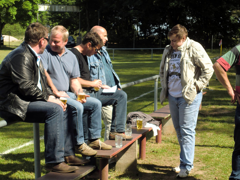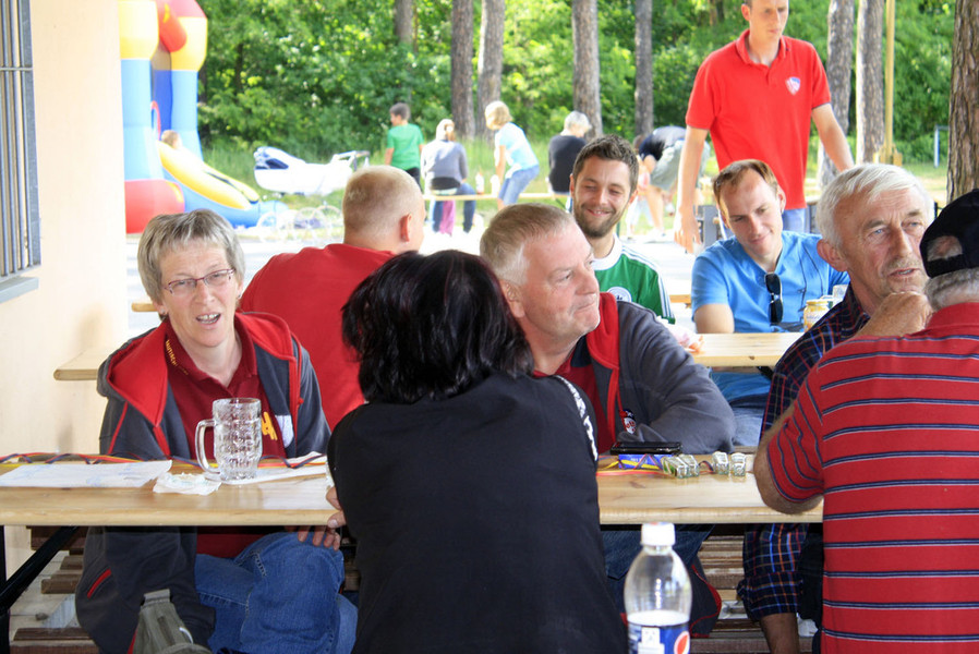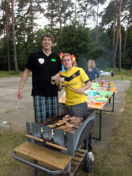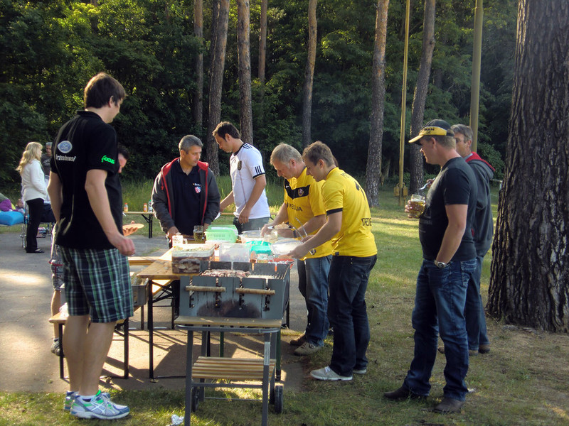 Nach diesem kurzen aber launigen Pflichtprogramm durfte dann endlich der Grill gestürmt werden. Und hier hatten die beiden „Grillbeauftragten“ Torsten Lotsch und Stefan Schmilas alle Hände voll zu tun um die etwa 50 hungrigen Gäste satt zu bekommen. Aber auch das klappte ähnlich reibungslos wie die Getränkeversorgung, die Ralf Kittner und Dirk Heinrich übernahmen. Auf ein kleines Dankeschön von der Mannschaft für diese tolle Unterstützung dürfen sich diese beiden schon freuen. Als Höhepunkt des Abends wartete aber noch das gemeinsame Public-Viewing im extra errichteten VfB-Fanzelt. Während dort die erste Überraschung dieser Euro durch die Dänen (1:0 über Holland) noch einige Partygäste kalt ließ, hatte spätestens beim abspielen unserer Nationalhymne auch den Letzten das EM-Fieber gepackt. Schnell waren die besten Plätze besetzt und das Anfeuern und Mitfiebern konnte beginnen. Mit dem späten Treffer durch Mario Gomez war dann alle Anspannung verflogen und der Jubel kannte keine Grenzen.