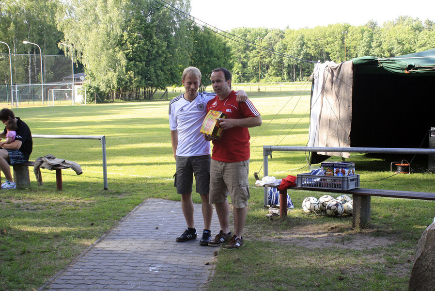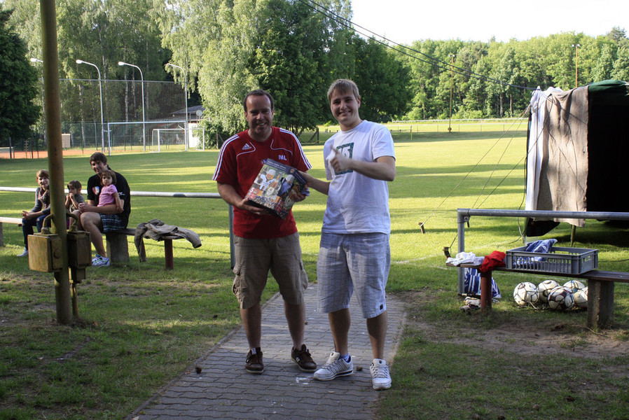 Und wie immer hatten sich unsere Jungs dafür einiges einfallen lassen. Kaffee und Kuchen, bzw. Freibier für die treuen Anhänger gehörten ebenso zum Programm wie Partymusik und eine Hüpfburg für die vielen kleinen Gäste. Als Trainer Marco Lust am späten Nachmittag zum offiziellen Teil der Veranstaltung lud, war der Frust über den ärgerlichen Punktverlust schon fast vergessen. So gab es für seine Einschätzung, „eine starke Saison gespielt zu haben“, auch anerkennenden Applaus für unsere Mannschaft. Dabei sah er nicht nur auf die erfolgreichen Spiele in der KOL zurück, sondern erinnerte auch an die erfolgreiche Hallenkreismeisterschaft im Winter, bei der unsere Jungs den 3. Platz erreichten. Ebenfalls lobende Worte fand er für unsere Alten-Herren, die bei der Tangerhütte Volkssportrunde einen weiteren Titel für unseren Verein gewannen. Außerdem dankte er allen ehrenamtlichen Helfern, die den Verein und die Mannschaft während der abgelaufenen Spielzeit unterstützten. Besonderer Dank ging dabei an Stephan Heinert für seine Arbeit rund um den Internet-Auftritt des VfB, der vor kurzem vom Kreisfußball-Verband als „attraktivste Homepage“ ausgezeichnet wurde. Als Abschluss hatte sich der Trainer dann die Ehrung des besten Spielers der Saison aufgehoben. Unter donnerndem Beifall überreichte er die Sieger-Trophäe an Michael Woop, der damit seinen Vorjahreserfolg wiederholte. Nur knapp geschlagen landete Torhüter Nigel Kempchen auf dem 2. Rang. Auf Platz 3 hatte die Mannschaft den besten Torjäger der Saison Christian Lust gewählt. Erneut ohne Titel blieb dagegen Manndecker Florian Kronfeldt, der trotz seiner bärenstarken Saison auf Rang 4 landete.