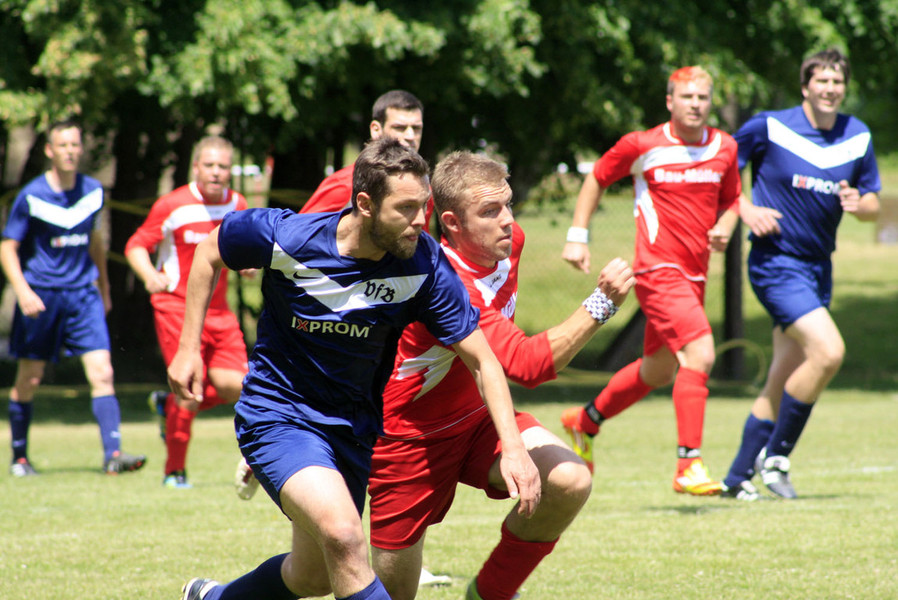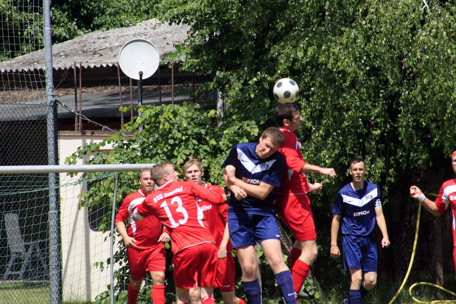Als hätte es die Pause nicht gegeben starten beide Teams mit Vollgas in den zweiten Durchgang. Einen Kempchen-Abschlag verlängert Lust perfekt in den Lauf von Ronny Pfeiffer doch unser Spielmacher platzierte seinen Lupfer zwar über den Torhüter aber leider neben das Tor. Und auch die nächste Szene begann mit einem Abschlag des VfB-Torhüters. Kempchens verunglückte Versuch landete noch in der eigenen Hälfte beim Gegner und plötzlich lief Toni Thiemann allein auf den VfB-Kasten zu, zum Glück nagelte der Gästestürmer den Ball aber an die Querlatte. Auf der Gegenseite konnte Libero Hoffmann Christian Lust nur mit einem Foul stoppen. Von halbrechts brachte Stefan Schmilas den fälligen Freistoß in den Strafraum und „Sprutz“ köpfte das Spielgerät unhaltbar zur Führung ein. Erneut ein wichtiger Treffer unseres Stürmers und endlich mal ein Freistoß wie ihn unser Trainer schon die ganze Saison fordert. Bevor die Gäste auf diesen Rückschlag reagieren konnten, hatte Ronny Pfeiffer dann die Entscheidung auf dem Fuß. Nach einem herrlichen Steilpass setzte er sich gut gegen Hoffmann durch und lupfte dann, frei vor dem Tor, dem herauseilenden Keeper den Ball in die Arme. Kurz darauf meldeten sich die Gäste eindrucksvoll zurück ins Spiel. Bei einem Angriff über unsere Linke Außenbahn verteidigten Bolle und Pfeiffer nicht energisch genug, der Ball kam etwas glücklich zu BSC-Kapitän Rosentreter und der jagte die Kugel aus etwa 20m unhaltbar ins linke obere Toreck. Da in der Folge beide Teams auf Sieg spielten entwickelte sich eine spannende Schlussphase. Nach einem Schmilas-Freistoß verpasste Hoffmann und Christian Lust köpfte platziert, doch Wittrien parierte mit einem tollen Reflex. Dann versuchte es Linksfuß Schmilas mal selbst, doch sein Schuss aus gut 20m strich über den Torwinkel. Den letzten Riesen hatte dann unser Kapitän auf dem Fuß. Nach einem Flankenlauf von Robert Bolle, passte Christian Lust auf Stefan Schmilas, der zog Richtung kurzer Pfosten, legte dann quer aber David Mielke erwischte das Leder nicht voll und setzte es neben das freie BSC-Gehäuse. Da aber auch die Gäste bis zum Schlusspfiff gefährlich blieben, war am Ende niemand so recht zufrieden mit dem einen Punkt.
