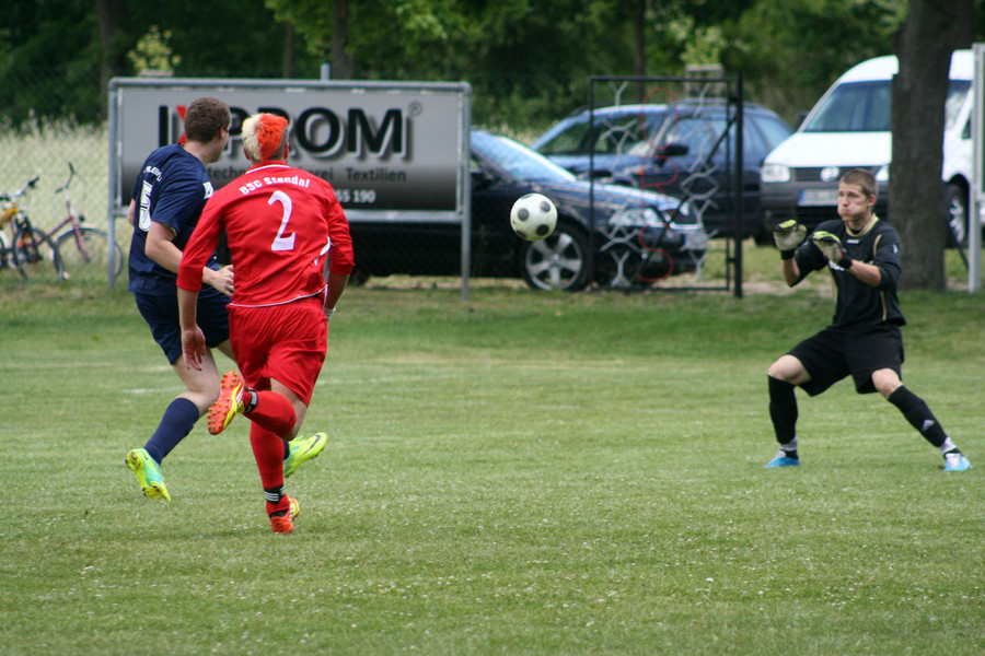 Bei Zuschauerunfreundlichem Wetter erwischten die Gastgeber den besseren Start. Aus dem optischen Übergewicht entstanden allerdings keine Tormöglichkeiten. Besonders die Flanken und Freistöße von Linksaußen Brohmann sorgten für Gefahrenmomente, fanden aber nie einen Abnehmer. Den ersten nennenswerten Torschuss gab Tobias Trefflich ab, Stephan Heinert im VfB-Kasten konnte aber klären. Wenig später war es erneut Trefflich der nach Ablage von BSC-Kapitän Soisson abzog aber deutlich über den Kasten zielte. Nach gut einer halben Stunde sorgte Rudi Matterne mit einem 20m-Schuss für das erste Lebenszeichen unserer Elf. Bis dahin waren unsere Jungs fast nur im Rückwärtsgang unterwegs. Viel zu selten kamen die Entlastungsangriffe bis zum gegnerischen Strafraums. Gefährliche Offensivaktionen gab es einfach nicht. Spielerisch enttäuschten beide Teams auf ganzer Linie. Viele technische Fehler, schlimme Fehlpässe und planloses Gebolze bestimmten die erste Spielhälfte. In der Schlussphase der ersten Halbzeit dann fast doch noch die Führung für unsere Mannschaft. Nach einem Foul an Marcel Böters entschied Schieri Leppin auf Freistoß aus halbrechter Position. Stefan Schmilas versuchte es direkt aber BSC-Keeper Fuhrmann war mit einer schönen Flugeinlage rechtzeitig zur Stelle und entschärfte wenig später auch den Nachschuss von Pierre Dobberkau. Kurz vor dem Pausenpfiff dann noch ein Aufreger auf der anderen Seite. Nachdem BSC-Angreifer David Büst einen Ball an Stephan Heinert vorbei ins Toraus gespitzelt hatte, entschied das Schiedsrichterteam irrtümlich auf Eckball. Auch die Uetzer Proteste und die Nachfrage beim Stendaler Stürmer brachten keine Aufklärung aber zum Glück blieb auch der unberechtigte Eckball ohne Erfolg. Der bis dahin völlig wirkungslose Ronny Pfeiffer setzte mit einem feinen Solo und sattem Abschluss den Schlusspunkt hinter diese schwache erste Spielhälfte. Nach dem Pausentee wirkte unsere Elf dann wesentlich wacher. Und im Gegensatz zu den Hausherren reichte eine gute Möglichkeit zur Führung. Ronny Pfeifer spielte perfekt in die Gasse und Rudi Matterne blieb eiskalt und verwandelte sicher. Und unsere Jungs legten nach. Nach einem Pfeiffer Eckball setzte sich Christian Lust im Luftkampf durch, doch sein Kopfball prallte vom Lattenkreuz zurück ins Spiel. BSC-Coach Müller musste nun reagieren und tat das mit einem Doppelwechsel. Mit Flint und Wiegelt kamen zwei frische Offensivkräfte und die brachten sofort neuen Schwung. Ein VfB-Angriff verpuffte am gegnerischen Strafraum, da Ronny Pfeiffer ein schwaches Abspiel nicht erreichte. Beim Einwurf reagierte dann Rudi Matterne zu unentschlossen und schon war Ricky Flint auf dem rechten Flügel auf und davon. Seine Flanke landete perfekt am langen Pfosten wo Toni Thiemann per Direktabnahme vollstreckte. Damit war die Partie wieder offen und wurde von da an noch umkämpfter und hitziger. Aber unsere Mannschaft steckte nicht auf und ging sofort wieder in die Offensive. Und einer wollte an diesem Nachmittag den Sieg unbedingt. Geburtstagskind Michael Woop war erneut ein zuverlässiger Abräumer vor der Abwehr und trieb zudem mehr und mehr das Offensivspiel an. Mit dem 2:1 krönte der nun 28-jährige seine Leistung und beschenkte sich damit gleich selber. Nach einer Flanke von links kam Michi eher zufällig an die Kugel, kämpfte sich dann in den Sechzehner, wo er deutlich hörbar gefoult wurde, blieb aber auf den Beinen und jagte das Spielgerät unhaltbar in die linke untere Torecke. Die Stendaler stemmten sich danach mit Macht gegen die drohende Niederlage, schossen dabei aber mehrfach über das Ziel hinaus. Beleidigungen, Provokationen und unnötige Härte bestimmten in dieser Phase das Spielgeschehen. Unschöner Höhepunkt war ein übles Foul von David Büst gegen Marcel Böters. Zusätzliche Unruhe brachten auch die teilweise unverständlichen Entscheidungen des Schiedsrichterteams in die ohnehin schon hitzige Partie. So gab es in dieser Szene anstelle einer gelben, oder sogar roten Karte für Büst, eine gelbe Karte für VfB-Keeper Heinert wegen lautstarken Reklamierens. Unsere Jungs blieben in der Folge weitestgehend unbeeindruckt von der zunehmenden Hektik und fanden erneut die richtige Antwort. Ein Konter über Ronny Pfeiffer landete bei Christian Lust der seinen Bewacher umkurvte dann aber kurz vor dem Sechzehner unfair gestoppt wurde. Auch dafür gab es keine Karte aber immerhin den nächsten Freistoß. Der direkte Versuch von Stefan Schmilas konnte dabei noch abgewehrt werden aber gegen die anschließende Direktabnahme von Ronny Pfeiffer war die BSC-Defensive um Torhüter Fuhrmann machtlos. Aus knapp 16 Metern schlug das Leder erneut links unten ein. Das 3:1 war dann auch die Entscheidung. Die Männer vom Bierkeller fanden nicht mehr zurück ins Spiel und kamen in der verbleibenden Zeit nur noch zu einem Torschuss, der aber deutlich über die Torlatte flog. Auf der anderen Seite traf der eingewechselte Enrico Stage sogar noch zum 4:1, wurde aber wegen einer Abseitsstellung zurück gepfiffen. So blieb es bei dem auf Grund der guten zweiten Spielhälfte nicht unverdienten 3:1 für unsere Elf. Nach dem Schlusspfiff feierten unsere Kicker ausgelassen mit den mitgereisten VfB-Fans ihren zehnten Saisonsieg.