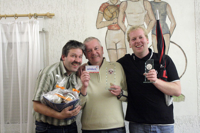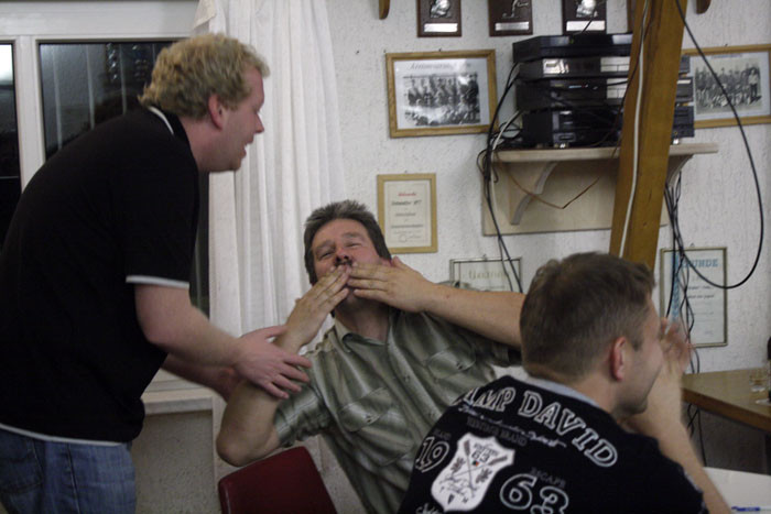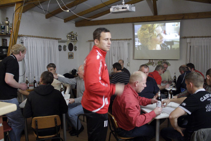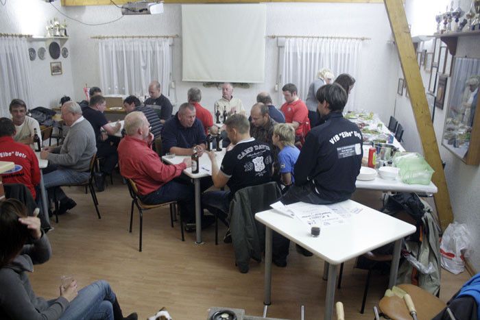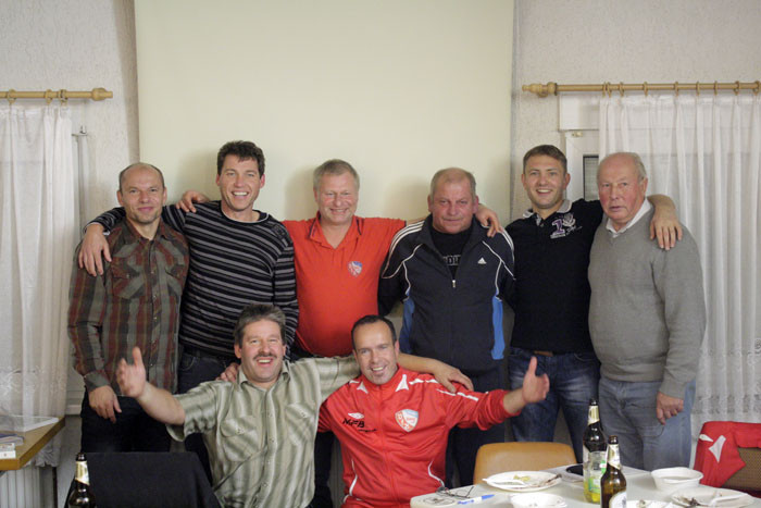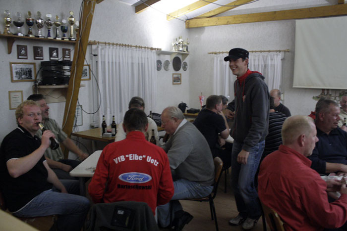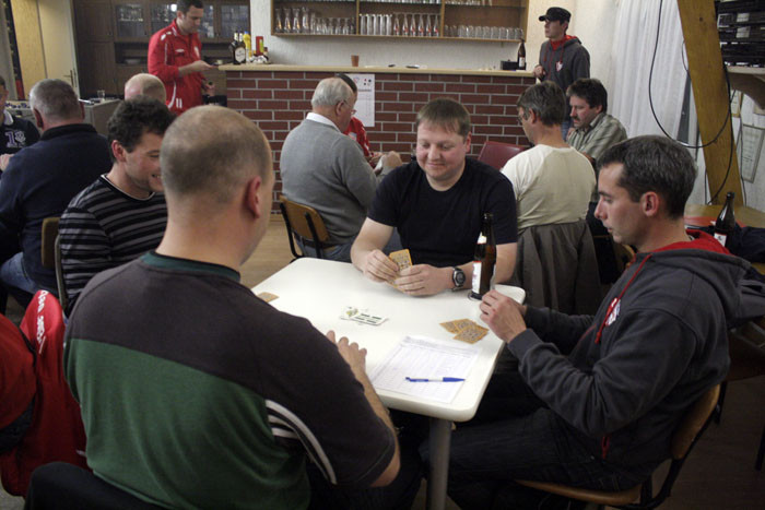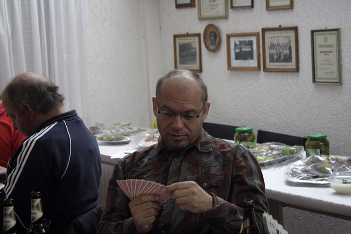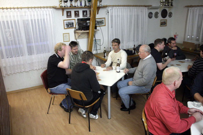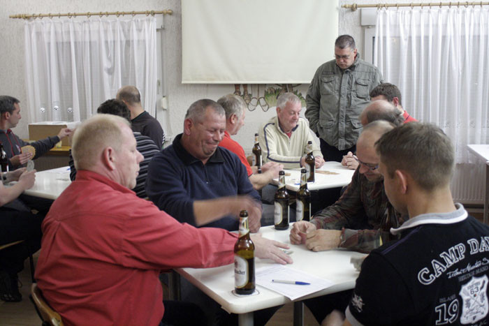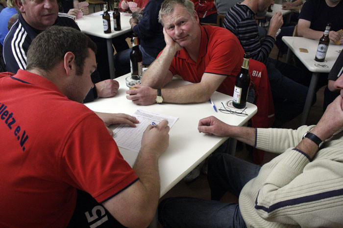 Mit etwas Verspätung begrüßte Organisator Christian Lust die 17 Spieler und die wenigen Schaulustigen im Vereinsheim. Seine Eröffnungsrede nutzte er um dem langjährigen Vereinsvorsitzenden Klaus Ruhnke ein schönes Erinnerungsfoto zu überreichen. Das Foto zeigte „Oskar“ im Kreis seiner alten Uetzer Fußballkumpel bei einem Heimspiel unserer Mannschaft. Nach kurzer Regelkunde wurden dann die Spieler ihren Tischen zugelost und das das große „Kartenkloppen“ konnte endlich beginnen. Im Gegensatz zur Premiere wurde dabei nicht nach Zeit gespielt, sondern nach einer vorgegebenen Anzahl an Spielrunden. Auch die zweite Neuerung, zur allgemeinen Stärkung stand eine reichhaltige Schlachteplatte bereit, kam bei allen Anwesenden sehr gut an. Für einen reibungslosen Getränkenachschub sorgten Christian Lust hinter der Bar und David Mielke der sich als Bedienung von seiner besten Seite zeigte. Nach mehr als vier Stunden Spielzeit kam dann auch der letzte Tisch zum Ende und alle warteten gespannt auf die Auswertung. Zur Siegerehrung ergriff dann wieder Christian Lust das Wort und verkündete in umgekehrter Reihenfolge die Platzierungen. So mussten zu aller erst die Verlierer des Abends Olaf Siegemund und Jürgen Hoff die Schadenfreude der anderen Spieler über sich ergehen lassen. Über Vorjahressieger „Oskar“ Ruhnke, der mit -50 Punkten nur auf Platz 12 landete, ging es rauf bis zu Rang 4 den sich Neuling Frank Raebel mit immerhin 90 Punkten sicherte. Unter großem Jubel wurden dann die Besten Spieler dieses Abends verkündet. Dritter mit 120 Punkten wurde der Cobbeler Olaf Gadge. Bei der Premiere war „Oli“ als vierter noch knapp an den Preisen vorbeigeschrammt. Dieses Mal freute er sich über den Bronzepokal und ein schönes Schlachtepaket. Damit stand es fest, die beiden ersten Plätze gingen an die Familie Heinert. Stephan erspielte sich am Fünfertisch mit 150 Punkten Rang 2 und wurde dafür mit dem Vize-Pokal und einem VfB-Regenschirm belohnt. Wenig später überreichte Christian Lust dann Vater Harald Heinert unter großem Applaus den Siegerpokal. Der Bertinger holte stolze 200 Punkte und durfte sich neben dem Pokal auch über eine Jahreskarte für die Punktspiele der Uetzer Fußballer freuen. In geselliger Runde wurde dann einige Getränke später der Abend beendet und eine Neuauflage der Veranstaltung im Jahr 2012 beschlossen.