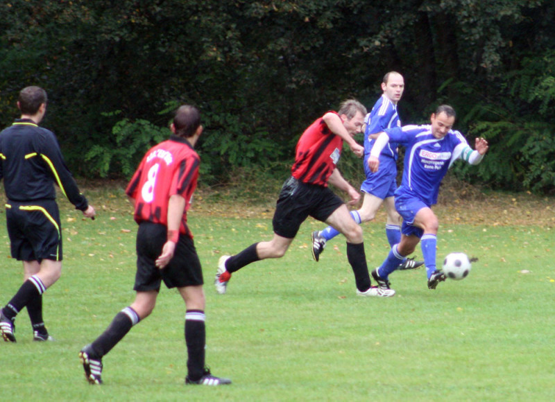 Auch zu Beginn der zweiten Hälfte setzten beide Teams ihr mäßiges Spiel fort. Gegenseitig wurde ein ordentlicher Spielaufbau verhindert, der anhaltende Regen tat sein übriges. Umso überraschender dann die plötzliche Führung für die Hausherren. Den eigentlichen Angriff hatte die VfB-Abwehr schon abgewehrt, doch Rudi Matterne übersah den hinter ihm lauernden Danny Hinze, der eroberte sich die Kugel und zog in den Strafraum wo Rudi seinen Fehler nur noch mit einem Foul ausbügeln konnte. Carsten Horn trat an und verwandelte den Strafstoß sicher. Der 31. Saison-Treffer für den 28-jährigen Spielmacher. Nach diesem Rückstand wachte unsere Mannschaft endlich auf und spielte mutiger nach vorne. Ein Heinert-Abschlag auf Robert Bolle übersprang unseren Stürmer aber auch seine Bewacher und so hatte plötzlich David Mielke freie Bahn, doch sein Schuss verfehlte leider das Tor. Auch durch die zunehmende Intensität kam dann in der letzten halben Stunde doch noch so etwas wie Derby-Stimmung auf. Immer wieder gab es kleine Fouls auf beiden Seiten, die Freistöße nach sich zogen. Einen davon brachte Rudi Matterne scharf in den Torraum aber auf dem nassen Grün wurde der Ball so schnell, dass sowohl der eingewechselte Christian Lust als auch David Mielke knapp verpassten. Kurz darauf setzte sich der ebenfalls eingetauschte Marcel Böters auf dem rechten Flügel durch, passte dann in den Sechzehner auf David Mielke, doch schon bei der Ballannahme wurde unser Kapitän unfair gestoppt. Schiri Andreas Last zeigte erneut auf den Punkt und lag wieder richtig. Etwas glücklich war diese Situation für unser Team aber doch, denn an der Strafraumkante mit dem Rücken zum Tor wäre David nicht zwingend zum Torschuss gekommen. Ronny Pfeiffer übernahm die Verantwortung und traf zum wichtigen Ausgleich. Mit diesem Treffer kippte dann auch das Spiel. In den verbleibenden 10 Minuten drängte unsere Elf sogar auf ein zweites Tor. Und zwei gute Möglichkeiten gab es noch. Erst startete David Mielke nach einem Steilpass in den Sechzehner, spitzelte die Kugel am Keeper vorbei, bevor ihn SVG-Verteidiger Wittwer umgrätschte. Doch Schieri Last hatte in dieser Szene kein Foul gesehen und ließ weiterspielen. Aber vielleicht hatten die Unparteiischen an diesem Nachmittag auch schon genug Elfmeter gesehen. Denn auch im anderen Strafraum blieb die Pfeiffe nach einer ähnlich kniffligen Situation stumm. Kurz vor dem Schlusspfiff dann fast doch noch der goldene Treffer. Christian Lust verlängerte einen Heinert-Abschlag auf Enrico Stage, der leitete weiter auf David Mielke. David zog von rechts in den Strafraum, legte den Ball zurück aber dort wurde das Spielgerät vor dem einschussbereiten Stage weggeschlagen. Da auch den Gastgebern nur noch ein Abseitstreffer gelang, blieb es am Ende beim leistungsgerechten 1:1 Unentschieden.