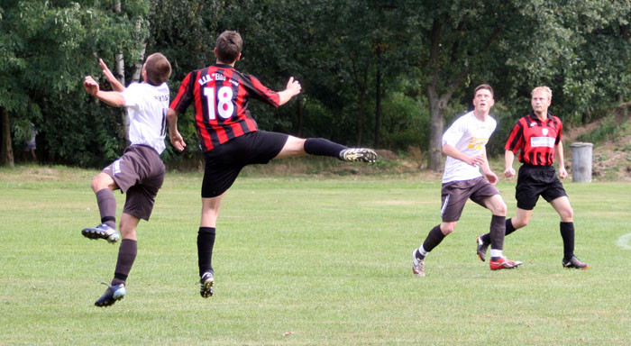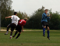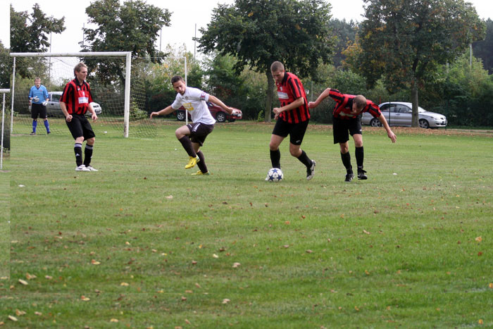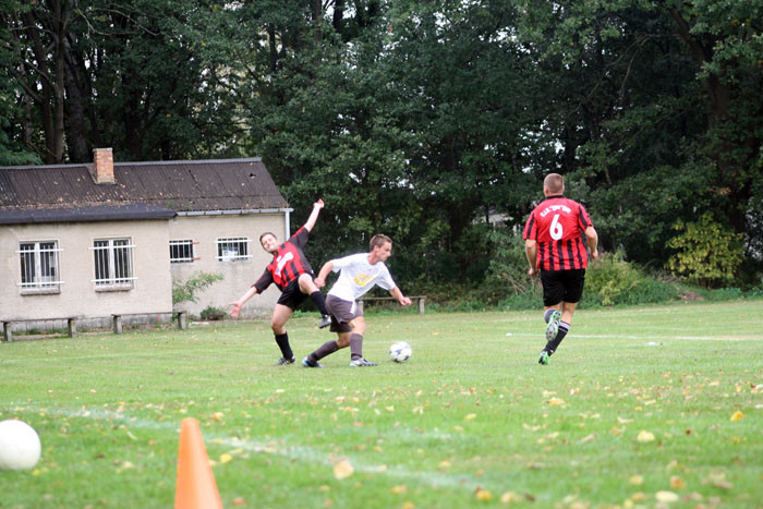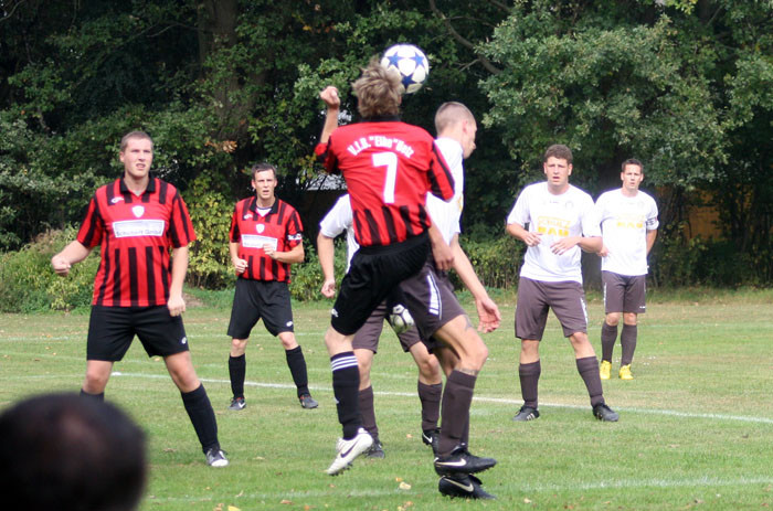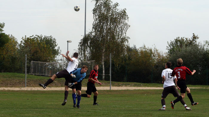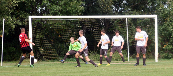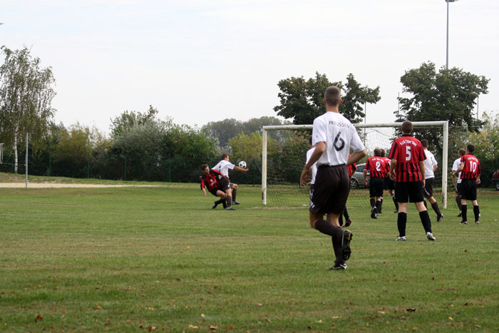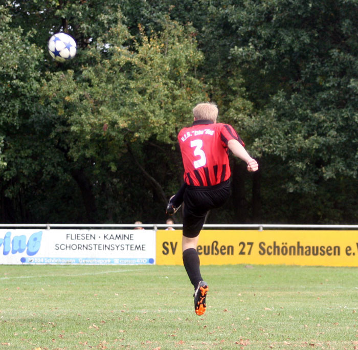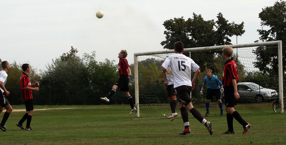 Mit leicht veränderter Anfangsformation ging unser Team in die zweite Partie an diesem Wochenende. So begann Rudi Matterne für den verletzten Torsten Bruns auf der Liberoposition und Marcel Böters ersetzte Christian Kroll im linken Mittelfeld. In einer zerfahrenen Anfangsphase hatten die Gastgeber gleich zwei gute Einschussmöglichkeiten. VfB-Torhüter Nigel Kempchen (musste kurzfristig für den beim Aufwärmen angeschlagenen Stephan Heinert einspringen) war jedoch beide Male zur Stelle. In einem schwachen Pokalmatch mit einer Vielzahl von Fehlern auf beiden Seiten war unsere Elf leicht spielbestimmend. Mitte der ersten Hälfte führten dann einige schnell vorgetragene Spielzüge zu weiteren Tormöglichkeiten. Aber sowohl David Mielke als auch Ronny Pfeiffer und Robert Bolle scheiterten mit ihren Schussversuchen. Die beste Gelegenheit bekam nach 25. Spielminuten dann der mit aufgerückte Pierre Dobberkau. Nach einer Schmilas-Ecke war unser Vorstopper am langen Pfosten völlig frei, drückte das Leder mit seinem schwächeren rechten Fuss aber nur an den Außenpfosten. Fast im Gegenzug erspielten sich dann die Preußen ihre nächste Großchance. Kevin Bacholke, der sich über die gesamte Spielzeit packende Duelle mit Florian Kronfeldt lieferte, hatte sich am rechten Flügel durchgesetzt und fein zurück gepasst, doch Alex Klarowitz jagte den Ball über das Tor. Nach einer guten halben Stunde fiel dann die Führung für unsere Jungs. Ronny Pfeiffer hatte an der Mittellinie den Ball erobert, in Strafraumnähe David Mielke angespielt, der leitete sofort auf Stefan Schmilas weiter und unser Rechtsaußen schob das Leder aus halbrechter Position am herauseilenden Torhüter vorbei ins Netz. Nur zwei Minuten später dann sogar das vermeintliche 2:0. Bei einem Schmilas-Freistoß köpfte Kapitän David Mielke den Ball vor Torhüter Elling ins Netz, stand aber zuvor knapp im Abseits. Bis zum Pausenpfiff blieb unser Team spielbestimmend ohne sich jedoch weitere Tormöglichkeiten zu erspielen. Im zweiten Durchgang erwischten dann die Gastgeber den besseren Start. Nach einer Flanke stieg Kevin Bacholke höher als David Mielke köpfte aber über die Querlatte. Kurz darauf leitete ein Querschläger im Mittelfeld die nächste Großchance für die Hausherren ein. Im Vorwärtsgang stand unsere Abwehr unsortiert, zudem wurde Pierre Dobberkau als letzter Mann gefoult und plötzlich hatte Klarowitz freie Bahn scheiterte jedoch am erneut glänzend reagierenden Kempchen. Eine ähnliche Spielsituation führte nur wenige Minuten später zum Ausgleich. Bei einem hoch abspringenden Ball verschätzte sich Rudi Matterne total und wieder war Klarowitz allein Richtung Tor unterwegs. Auch dieses Mal parierte Kempchen prima, musste dann aber mit ansehen wie Kevin Bacholke den Nachschuß zum 1:1 versenkte. Die Partie war weiterhin nicht hochklassig, bot aber Spannung und Torchancen auf beiden Seiten. Nach schönem Flankenwechsel versuchte es Ronny Pfeiffer mit einem Fernschuss, auf der anderen Seite parierte Kempchen gegen Bacholke. In der 56. Minute machte es Ronny Pfeiffer dann besser. Einen scharfen Ball verlängerte Marcel Böters am linken Flügel in den Lauf von Ronny und der zog direkt ab und überraschte damit den Keeper – die erneute Führung. Schönhausen riskierte danach mehr und sorgte besonders bei Eckbällen und weiten Einwürfen immer wieder für Gefahr. Ein solcher Einwurf brachte auch die nächste hundertprozentige für die schwarz-weißen. Andy Bolle erwischte den Ball im Fünfmeterraum perfekt doch Nigel Kempchen lenkte die Kugel mit einem tollen Reflex noch über die Latte. Die beste VfB-Chance in dieser Phase hatte Angreifer Robert Bolle, sein Heber flog allerdings auch über das Tor. In der Schlussphase konnte sich unsere Elf dann kaum noch aus der eigenen Hälfte befreien. Drei Minuten vor dem Spielende fiel dann fast folgerichtig doch noch der Ausgleich. Nach einem weiten Freistoß war Richard Strehmel mit dem Kopf zur Stelle und der Ball senkte sich unerreichbar hinter Nigel Kempchen ins lange Eck. In den verbleibenden Minuten suchten beide Teams die Entscheidung. Eine verunglückte Flanke vom eingewechselten Christian Kroll leitete schließlich den entscheidenden Konter ein. Den abgefangenen Ball schlug ein Preußen-Verteidiger sofort durch die viel zu offenen VfB-Defensive, Bacholke behauptete sich gegen den grätschenden Kronfeldt und überwand mit seinem Flachschuss auch Kempchen zum umjubelten Führungstreffer. In der Nachspielzeit kam unsere Elf nicht mehr gefährlich vor das gegnerische Tor und stand so am Ende etwas unglücklich aber vor allem unnötig mit leeren Händen da.