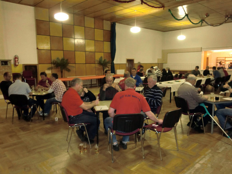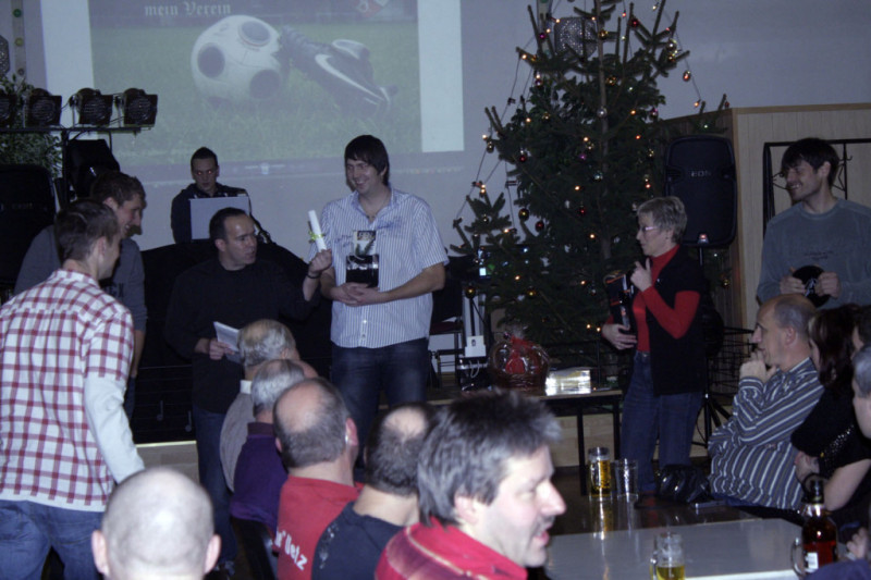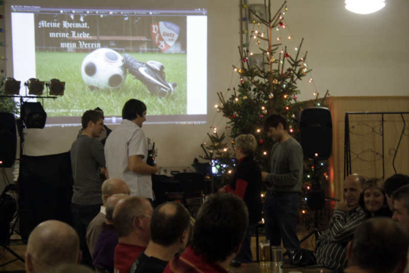 Eröffnet wurde der Abend mit den alljährlichen Weihnachtsturnieren im Würfeln und Doppelkopf. Auf Grund der zahlreichen Teilnehmer war es an allen Tischen spannend wie schon lange nicht mehr und die zweistündige Spielzeit verging wie im Flug. Am Ende freuten sich die fünf bestplatzierten der beiden Wettkämpfe über tolle Preise und den verdienten Applaus der Mitstreiter. Als Sieger des Abends konnten sich Marco Lust, der nach unzähligen Anläufen erstmals die Würfelkonkurrenz gewann, und Jens Ruhnke als Doppelkopf-Champion feiern lassen. Nach der Siegerehrung waren auch die letzten Gäste eingetroffen und so folgte nahtlos der nächste angenehme Punkt der Tagesordnung, der Sturm auf das Buffet. Nach der verdienten Stärkung ergriff Vorstandsmitglied (und frischgebackener Würfel-Meister), Marco Lust das Wort und leitete den offiziellen Teil des Abends ein. Mit Hilfe einer aufwendig gestalteten PowerPoint-Präsentation führte er die aufmerksamen Gäste noch einmal durch die Höhepunkte des Vereinslebens im abgelaufenen Jahr und wagte einen ersten Ausblick auf die geplanten Maßnahmen und Aktivitäten in den kommenden Monaten. Den zweiten Teil seiner Rede nutzte Marco dann um sich bei den vielen fleißigen Helfern und Unterstützern unseres Vereins zu bedanken. Vom Eintrittkassierer, über die Mädels vom Sportplatzverkauf, unseren Schiedsrichter bis hin zu den Sponsoren wurden alle mit Dank und Applaus bedacht. Auch hier half die Präsentation mit passenden Bildern und sorgte für den einen oder anderen Lacher.