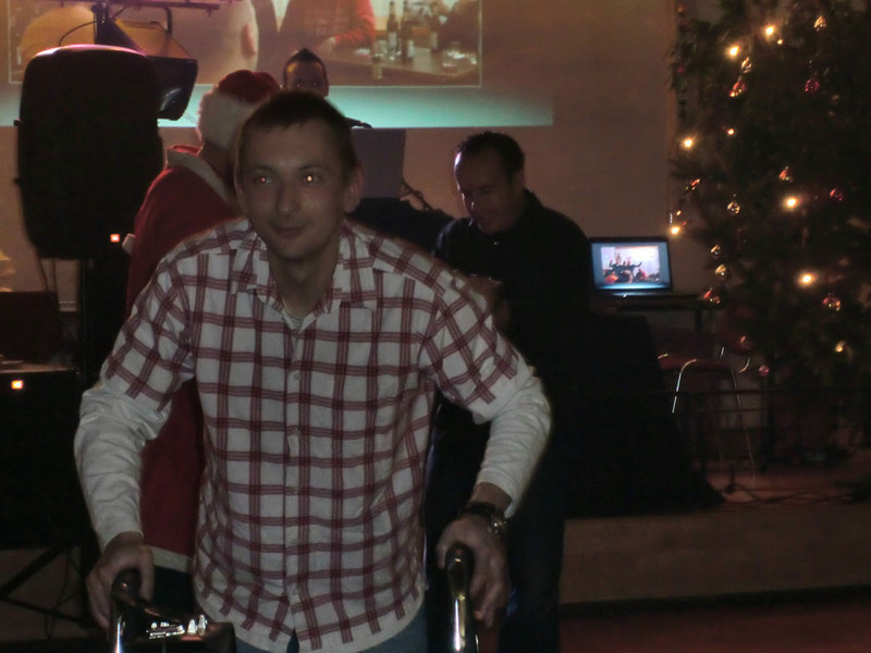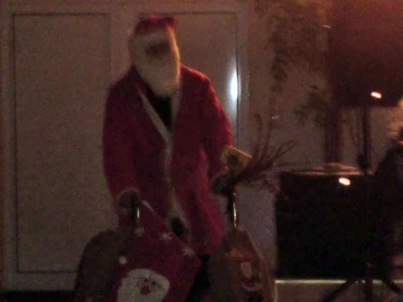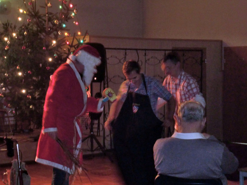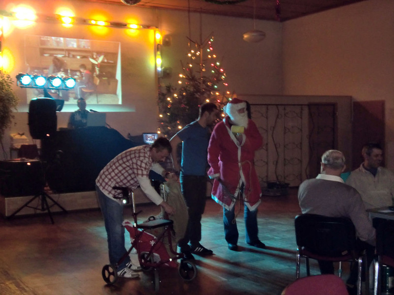 Damit war auch der vorletzte Programmpunkt des Abends „abgearbeitet“ und das Warten auf den Weihnachtsmann konnte beginnen. Und der „Alte“ ließ sich auch dieses Mal reichlich Zeit. Aber trotz der fortgeschrittenen Stunde erschien er dann topfit (das gab es auch schon anders) und perfekt vorbereitet. Zu seiner Unterstützung musste mal wieder der geübte Weihnachtswichtel „Brunsi“ herhalten, wurde dafür aber auch reichlich belohnt. Auf Grund seines fortgeschrittenen Alters und der zahlreichen Verletzungen bekam Torsten für seine weitere Wichtelkarriere einen modernen roten Rollator überreicht. Aber Santa hatte noch mehr in seinem Sack und ihm war mal wieder nichts entgangen. So dankte er Marc Meier für vorbildlichen Sportplatzdienst und verabschiedete VfB-Fan Christian „Uli“ Petrat mit ausreichend Fanartikeln ausgestattet ins ferne China. Und einmal mehr bekam auch sein „Liebling“ und Ex-Weihnachtself „Böti“ seine persönliche Weihnachtsüberraschung (aus Rücksicht auf Marcel führen wir das hier nicht weiter aus). Auch Sprücheklopfer David Mielke und Grillmeister Stefan Schmilas wurden bedacht und reichlich „beschenkt“. Eine besondere Strafe hatte sich der Weihnachtsmann dann noch für VfB-Stürmer Christian Lust ausgedacht. Dessen Panne beim Auswärtsspiel in Kamern, Christian hatte die Trikots vergessen, brachte ihm eine Rundumversorgung für alle VfB-Fans beim nächsten Auswärtsspiel und selbstverständlich schadenfrohes Gelächter ein. Zum Abschied und Dank erhielt der Weißbärtige einen VfB-Wimpel mit allen Unterschriften der Aufstiegself, ehe er unter donnerndem Applaus wieder in die Nacht verschwand. Das abwechselungsreiche Programm war damit beendet und die immer noch zahlreichen Gäste feierten weiter gutgelaunt bis in den frühen Morgen.