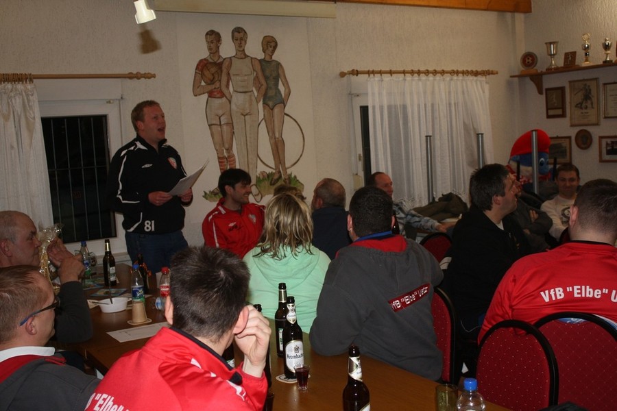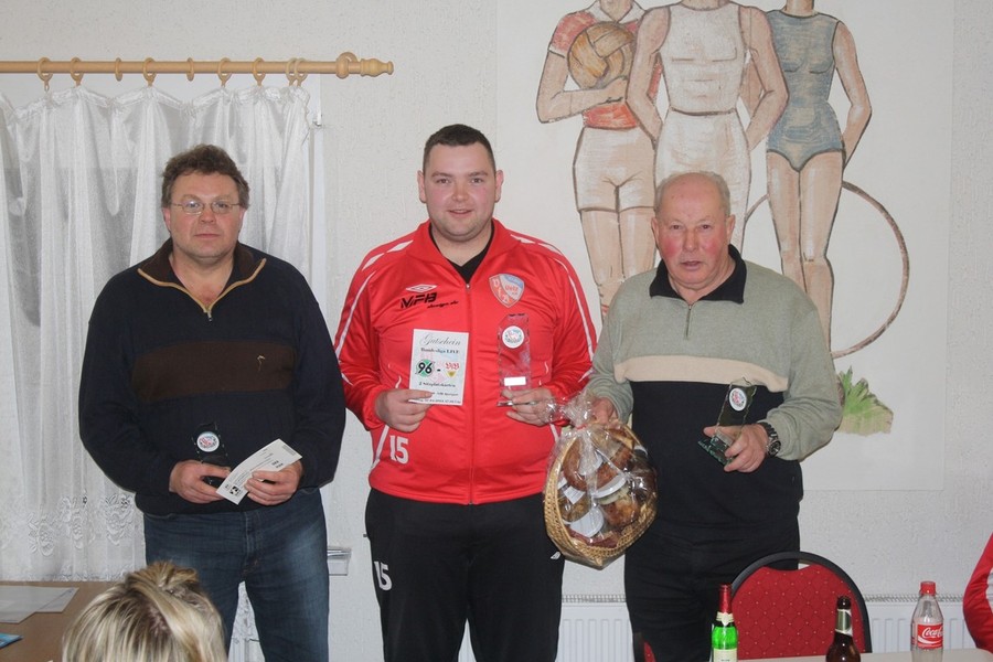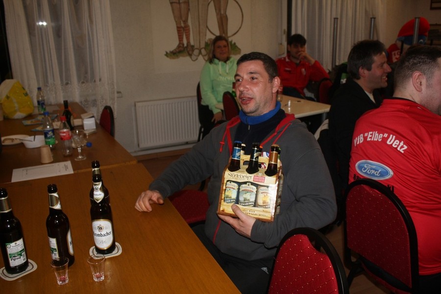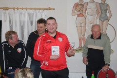 Zur Siegerehrung ergriff dann wieder Organisator Stephan Heinert das Wort und verkündete zunächst die Sieger beim Würfeln. Hier holte sich überraschend Lucas Vogt mit 15.900Punkten den Sieg. Dann ging es in umgekehrter Reihenfolge an die Doppelkopf-Platzierungen. Den letzten Platz und somit die „Rote Latterne“ holten sich diesmal Olaf Gadge und Jörn Blaneck mit -95 Punkten. Unter großem Jubel wurden dann die besten Spieler dieses Abends verkündet. Dritter mit 80 Punkten wurde Stefan „Pui“ Wichmann. Wie immer gerne dabei und diesmal nur knapp geschlagen, landete Klaus „Oskar“ Ruhnke mit 100 Punkten auf dem 2. Platz. Nur Einer konnte noch mehr Punkte sammeln, der Uetzer Tobias Mielke sicherte sich mit 105 Punkten den Sieg und den Hauptpreis: 2 Karten für das Bundesliga-Spiel Hannover 96 gegen VfB Stuttgart. Auch wenn der Preis für Fußball-Fachleute wohl eher eine Strafe ist, freute sich Tobi umso mehr.