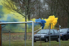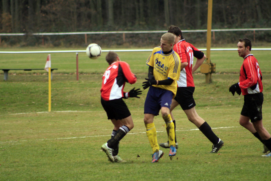 Doch dieser frühe Treffer wirkte lähmend auf das Uetzer Spiel. Anstelle von Spielfreude und Siegeswille bekamen die Zuschauer mehr und mehr spielerische Lethargie geboten. Die hohe Fehlerquote im Spielaufbau brachte zudem den Underdog zurück in die Partie. So kam die VfB-Defensive um Libero Michael mit zunehmender Spielzeit immer häufiger in Bedrängnis. Durch einen 20 Meter-Schuss von Kapitän Michael Blume kamen die Gäste dann das erste Mal gefährlich zum Abschluss. Die Offensivbemühungen unserer Elf waren in dieser Phase harmlos und stellten die Blau-Gelben nur selten vor Schwierigkeiten. Viel mehr lud das fehlerhafte Aufbauspiel die Gäste immer wieder zu Kontern ein. Einer dieser schnellen Gegenstöße leitete nach einer guten halben Stunde den Ausgleichstreffer ein. Einen Angriff über die linke Goldbecker Seite konnte Michael Woop im Strafraum nur noch per Foulspiel stoppen, den fälligen Strafstoß verwandelte Florian Jacobsen sicher. Fast 5 Minuten benötigten unsere Jungs für eine Antwort. Nach einem Konter über Christian Lust zog Stefan Schmilas aus 16 Metern ab, verfehlte das Ziel aber knapp. Den traurigen Höhepunkt dieser Angriffsversuche gab es dann in der 38. Spielminute zu sehen. Einen haltbaren Lust-Schuss klatschte Goldbecks Torhüter nach vorn ab, der heranstürmende David Mielke bekam die Kugel ans Knie und von dort trudelte der Ball am leeren vorbei ins Aus. Jetzt hatten auch die geduldigen VfB-Fans genug und machten ihrem Ärger lautstark Luft. Endlich aufgerüttelt starteten unsere Jungs in den verbleibenden Minuten eine Schlussoffensive. Nach einer genauen Kroll-Flanke scheiterte Christian Lust per Kopfball am gut reagierenden Pascal Dobberkau. In der 40. Minute war der Torhüter dann aber chancenlos. Im Anschluss an eine Schubert-Flanke war Christian wieder mit dem Kopf zur Stelle und dieses Mal zappelte die Kugel auch im Netz. Fast hätte David Mielke vor der Pause noch auf 3:1 erhöht. Nach einer Direktkombination mit Christian Lust scheiterte unser Kapitän aber aus halbrechter Position.