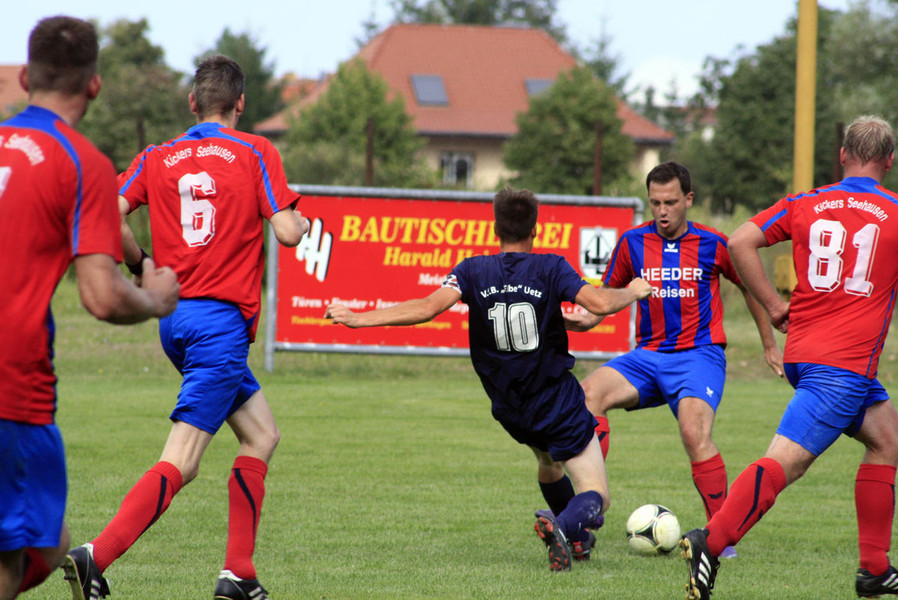 Da mit Pierre Dobberkau, Michael Woop und Stefan Schmilas drei Leistungsträger fehlten, musste Trainer Marco Lust gleich mehrere Änderungen in der Startelf vornehmen. Dennoch erwischte unsere Elf einen perfekten Start. Bereits in der 6. Spielminute eroberte Ronny Pfeiffer an der Strafraumgrenze den Ball, Seehausens Libero machte dabei keine Figur, und verwandelte sicher zur frühen Führung. Auch danach gab unser Team den Ton an und hätte in der 11. Minuten erhöhen müssen. Ronny Pfeiffer hatte in Strafraumnähe den aufgerückten Stefan Schubert angespielt, der steckte durch auf Christian Lust, doch unser Angreifer zielte aus etwa fünf Metern zu ungenau und scheiterte am guten Kickers-Torhüter Wieblitz. Und es ging weiter in eine Richtung. Einen Eckball verlängerte David Mielke mit der Hacke, Christian Lust zog sofort ab, doch erneut war der Keeper auf dem Posten. Nur fünf Minuten später startete dann Ronny Pfeiffer ein unwiderstehliches Solo durch den Gäste-Strafraum. Doch leider verpasste er am Ende das Abspiel und es blieb nur eine brotlose Einzelleistung. In der 35. Minute machte es unser Spielmacher besser und schickte seinen Nebenmann David Mielke auf die Reise, doch erneut war der Gäste-Torhüter aufmerksam dazwischen. Dann durfte sich auch unsere Nummer 1 einmal auszeichnen. Nach einem Eckball war Nigel Kempchen zur Stelle und lenkte die Kugel gekonnt um den Pfosten. Den schönsten Angriff zeigte unser Elf dann kurz vor dem Pausenpfiff. Mit einem einfachen Doppelpass spielte Christian Lust Christian Kroll frei und dessen Flanke fand den freistehenden David Mielke, der scheiterte an Wieblitz bekam aber eine zweite Chance und jagte das Leder mit viel Rückenlage und seinem schwächeren linken Fuß über das leere Tor. Unglaublich aber wahr, statt 2:0 oder sogar 3:0 ging es nur mit einer mageren 1:0-Führung in die Kabinen.