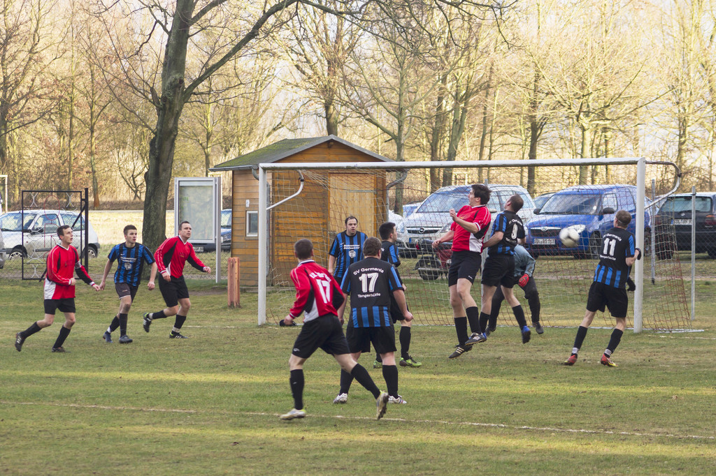 Auch im zweiten Abschnitt begannen beide Kontrahenten rasant. Erst verfehlte Stefan Schubert mit seinem Fernschuss das Gehäuse und wenig später zwang Germanen-Angreifer Heiko Bartels mit einem Schuss aus der Drehung Stephan Heinert zu einer Glanzparade. Ein schnell ausgeführter Einwurf von Ronny Pfeiffer leitete dann das 3:1 ein. Nach einem feinen Doppelpass mit David Mielke schob Stefan Schubert mit seinem schwachen linken Fuß das Leder in die lange Ecke. Kurz darauf hatte Christian Lust sogar das 4:1 auf dem Fuß. Nach einem Mielke-Solo konnten die Gäste den Ball nur halbherzig klären. Robert Bolle flankte genau auf unseren Torjäger, der zog aus der Drehung heraus sofort ab, doch Roussiere verhinderte mit einer tollen Fußabwehr den Einschlag. Und unsere Jungs gingen weiter fahrlässig mit ihren Möglichkeiten um. In Überzahl spielte Ronny Pfeiffer den Ball in den Rücken der mitgelaufenen Angreifer und leitete so den direkten Gegenzug. Aber auch die Gäste zeigten sich harmlos vor dem Tor und Stephan Heinert konnte die Situation klären.