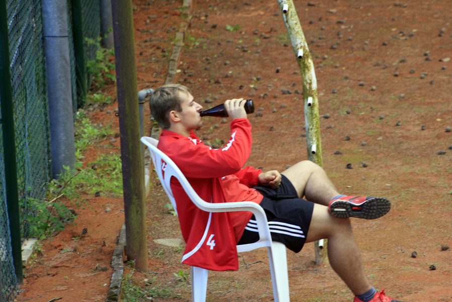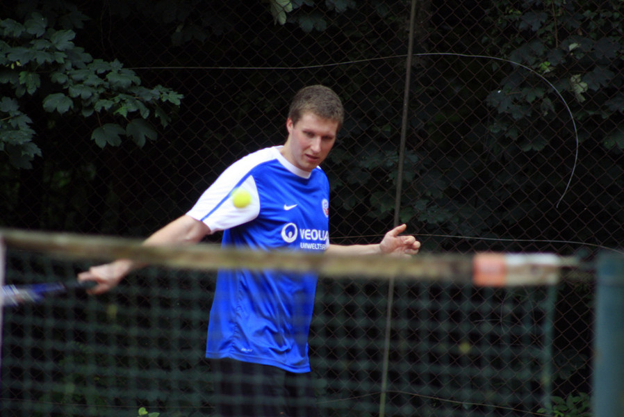 Besonders eng ging es in der sogenannten „Todesgruppe“ B zu. Alle 4 Spieler wussten zu überzeugen, doch nur der spätere Sieger Torsten Bruns zeigte die nötige Konstanz. Besonders die letzte Vorrundenpartie zwischen unseren Torhütern Stephan „Kasper“ Heinert und Nigel Kempchen sorgte bei den Zuschauern für Begeisterung und Entsetzen gleichzeitig. Geschlagene 80 Minuten dauerte der 7:6-Sieg des Bertingers Heinert. Vielen überragenden, langen Ballwechseln folgten einige „Unforced Errors“ (vermeidbare Fehler) und (gefühlte) minutenlange Pausen. Am Ende waren beide Spieler mit ihren Kräften am Ende und aus dem Turnier ausgeschieden.