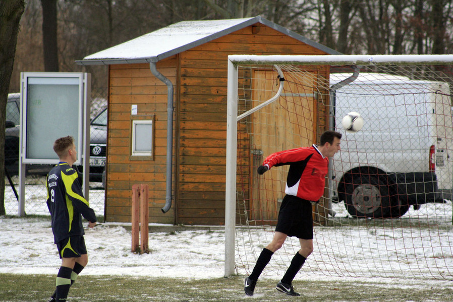 Auch nach dem Wiederanpfiff bot sich den knapp 70 Zuschauer das gleiche Bild. Unsere Elf kam deutlich druckvoller aus der Kabine und belohnte sich wieder früh für ihr Engagement. Zwar scheiterte Spieler-Trainer Marco Lust in der 52. Minute noch am Außenpfosten, als er eine Mielke-Flanke gerade noch mit der Fußspitze erreichte. Aber nur zwei Minuten später schlug Robert Bolle zu. Einen Schuss von Christian Lust wehrte Iglodan nach vorn ab und Robert nahm aus 22 Metern Maß und schweißte das Leder in die linke obere Ecke. Nach diesem Treffer steigerte sich der Frust bei den völlig überforderten Gästen, die völlig unnötig Hektik in die Partie brachten. Diese Unruhe schadete auch dem Spiel unserer Mannschaft. Nach einer Stunde sorgte der sonst souveräne Libero-Ersatz Marcel Böters für Gefahr vor dem eigenem Tor. Mit seinem schlampigen Abspiel bediente er Walslebens Stefan Huth mustergültig. Doch Nigel Kempchen hatte aufgepasst und grätschte Eintrachts Mittelfeldspieler außerhalb des Sechszehners ab. Die Gäste, die nach dieser Aktion einen Freistoß forderten, antworteten giftig. Besonders Andreas Schmidt war vom Spielverlauf sichtlich genervt. Erst trat er gegen Marcel Böters nach und nur Minute später VfB-Keeper Nigel Kempchen auf die Hand. Schiri Detlef Leppin, der das Spiel jederzeit souverän leitete, beließ es nach dieser unfairen Aktion bei einer gelben Karte für Walslebens Nummer 11. Weitaus schlimmere Folgen hatte der Tritt allerdings für unseren Keeper. Der Verwarnung die er für seine unschönen Worte auf dem Platz erhielt, folgte am Abend die bittere Diagnose im Stendaler Krankenhaus: Bruch des Mittelfingers an der rechten Hand.