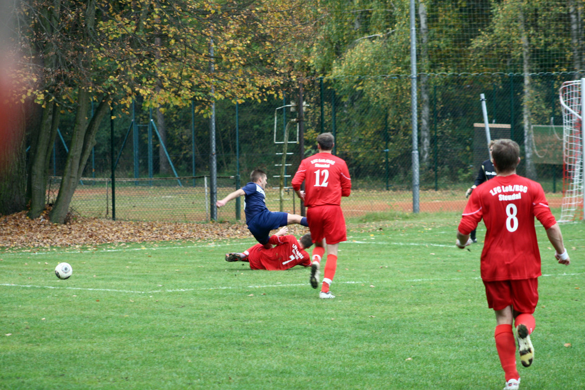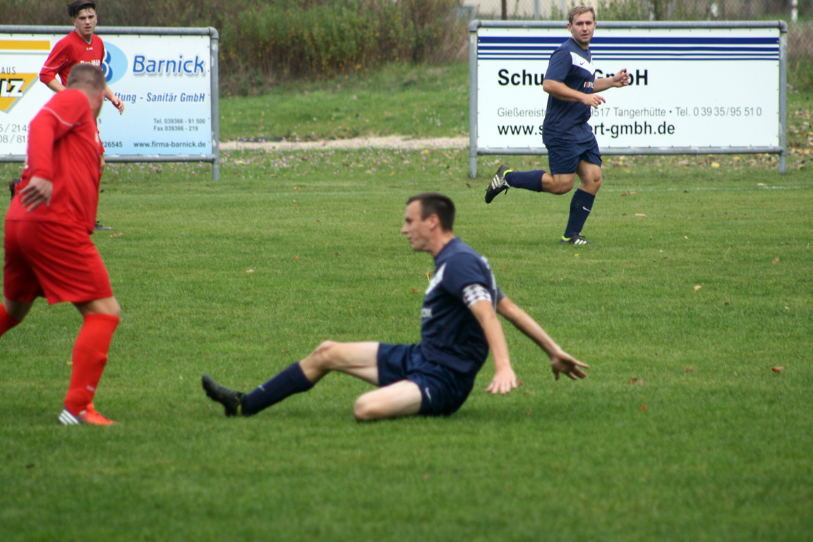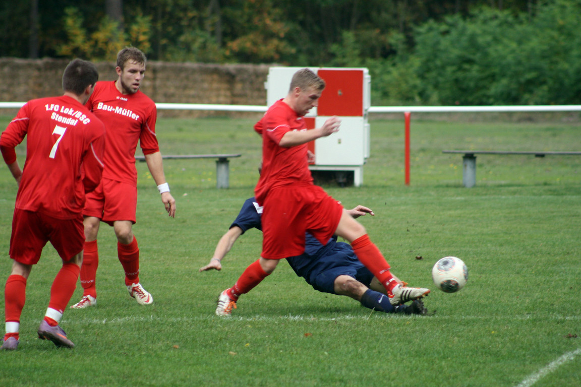Bis zur 26. Minute klappte dies auch recht ordentlich. Dann markierte Sebastian Soisson das 3:1. Fünf Minuten später erhöhte Maik Audorf sogar auf 4:1. Die Gastgeber dominierten die Partie jetzt eindeutig und kamen zu zahlreichen hochkarätigen Tormöglichkeiten. Unsere Jungs konnten sich nur selten befreien. Christian Lust sorgte mit einem flachen Freistoß noch einmal für Gefahr, mit vereinten Kräften konnte die Stendaler Hintermannschaft aber klären. Kurz vor dem Gang in die Kabinen stellte Mittelstürmer Tobias Völker mit einem Doppelpack den 6:1 Halbzeitstand her.
