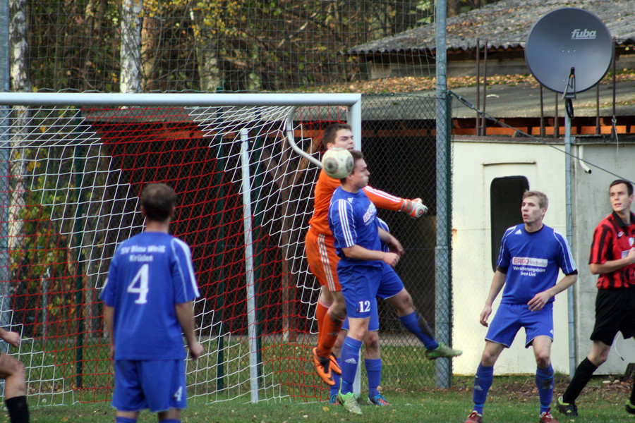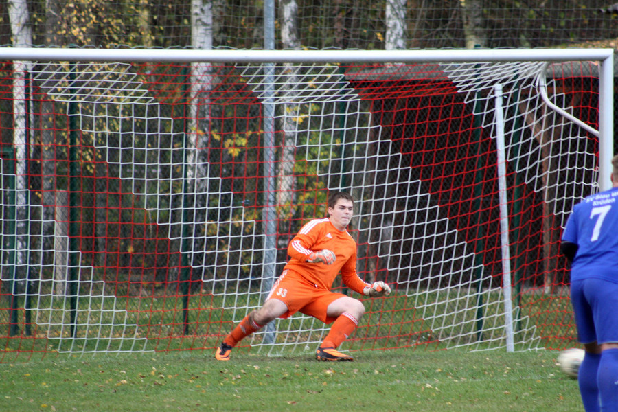 Aber auch die Gäste hatten offensiv wenig zu bieten. Zwar hatten sie deutlich mehr Spielanteile, diese aber vorwiegend im Mittelfeld. Die Sturmspitzen Kraft und Glombitza waren bei Marc Meier und Florian Kronfeldt in besten Händen, die Spielgestalter Stepanek und Nowak kamen gegen Stefan Schubert und Torsten Lotsch kaum zur Geltung. Vermehrt versuchte es der Favorit deshalb mit langen Bällen, welche meist eine sichere Beute für unsere Abwehrspieler waren. Aus dem Spiel heraus setzte dann Christian Kroll auf der anderen Seite das erste Ausrufezeichen. Mit einem starken Tempodribbling zog er von links in den Strafraum und hatte dann das Auge für den heranstürmenden David Mielke. Leider geriet der Querpass etwas zu lang und unser Kapitän kam einen Schritt zu spät. Wenig später hatte dann David aber doch die Führung auf dem Fuß. Einen Fehlpass in der Abwehrreihe nutzte unsere Nummer 10 und lief allein auf das Krüdener Tor zu, wurde aber im letzten Moment noch abgedrängt. Nach einer guten halben Stunde passte es dann besser: David Mielke steckte auf Ronny Pfeiffer durch, der nahm das Leder im Sechzehner sauber mit und wurde von seinem Gegenspieler unsanft von den Beinen geholt. Schiedsrichter Schulz entschied sofort auf Strafstoß. Christian Lust trat an und verwandelte gewohnt sicher zur Führung (35.). Und dieser Treffer zeigte Wirkung beim Tabellenführer, der in dieser Phase ungewohnte Schwächen in der Defensive offenbarte. Denn nur eine Minute nach dem Führungstreffer hatte unser Team sogar eine Doppelchance zum 2:0. David Mielke hatte sich super durch die Abwehrreihe gespielt, brachte dann aber die Kugel nicht am herauseilenden Torhüter vorbei. Den abgewehrten Ball jagte Stefan Schmilas mit seinem schwächeren rechten Fuß über den Torwinkel. Vor der Pause erhöhten die blau-weißen noch einmal den Druck. Mehr als drei gefährliche Eckstöße sprang aber nicht dabei heraus. Dafür spielte oder besser gesagt pfiff sich das Schiedsrichter-Trio mehr und mehr in den Mittelpunkt. Eine ganze Reihe eigenartiger Entscheidungen sorgten bei beiden Teams und auch bei den Zuschauern für Unverständnis. Höhepunkt der Ersten Spielhälfte war sicher ein nichtgegebener Strafstoß nach einem Foul an David Mielke. Das sein Gegenspieler den Ball nicht berührte war deutlich zu sehen, ebenso die Fahne des Assistenten, der sofort das Foulspiel signalisierte. Einzig der Unparteiische Schulz bewertete die Szene anders und ließ weiterspielen.