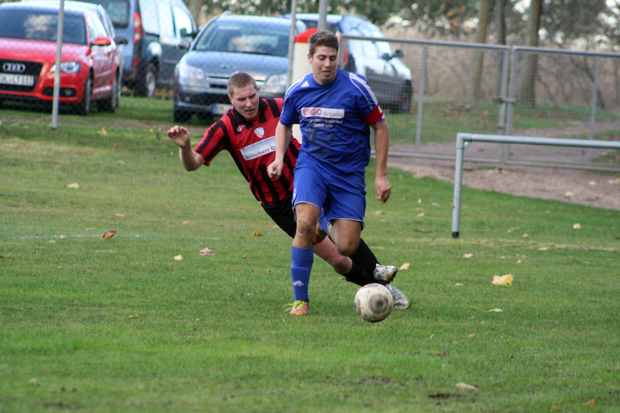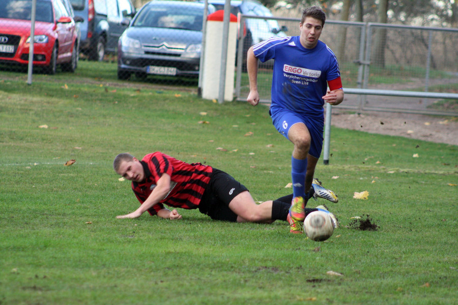 Nach vier sieglosen Spielen hatten unsere Jungs mit dem souveränen Tabellenführer eine ganz harte Nuss zu knacken. Dass mit Marcel Böters und Michael Woop erneut zwei Stammkräfte nicht mitwirken konnten, machte die Aufgabe nicht leichter. Gegen die torgefährlichste Offensivreihe der KOL setzte Trainer Torsten Bruns auf eine Defensivtaktik, die vor allem das Angriffstrio Glombitza, Kraft und Nowak stoppen sollte. Vom Anpfiff an setzte unsere Elf diese Marschrichtung perfekt um und kämpfte leidenschaftlich um jeden Ball. Anders als in den vorangegangenen Spielen kreierte unsere Mannschaft aber auch immer wieder eigene Offensivaktionen. Besonders auf den Außenbahnen sorgten Stefan Schmilas und Christian Kroll ständig für Unruhe in der Hintermannschaft der Gäste. Hochkarätige Torchancen blieben allerdings Mangelware. Mit einigen Eckbällen und Freistößen kamen unsere Männer zwar mehrmals in Tornähe, richtig gefährlich wurde es aber dabei nicht.
