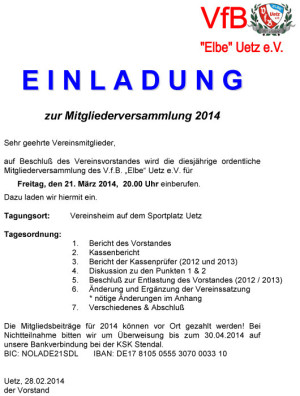 Der Vorstand des VfB „Elbe“ Uetz lädt alle Vereinsmitglieder für Freitag den 21. März zur jährlichen Mitgliederversammlung ein. Die Versammlung beginnt um 20.00 Uhr im Vereinsheim auf dem Sportplatz.