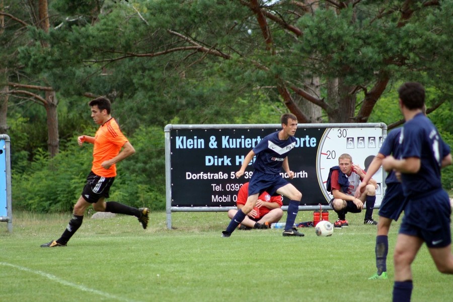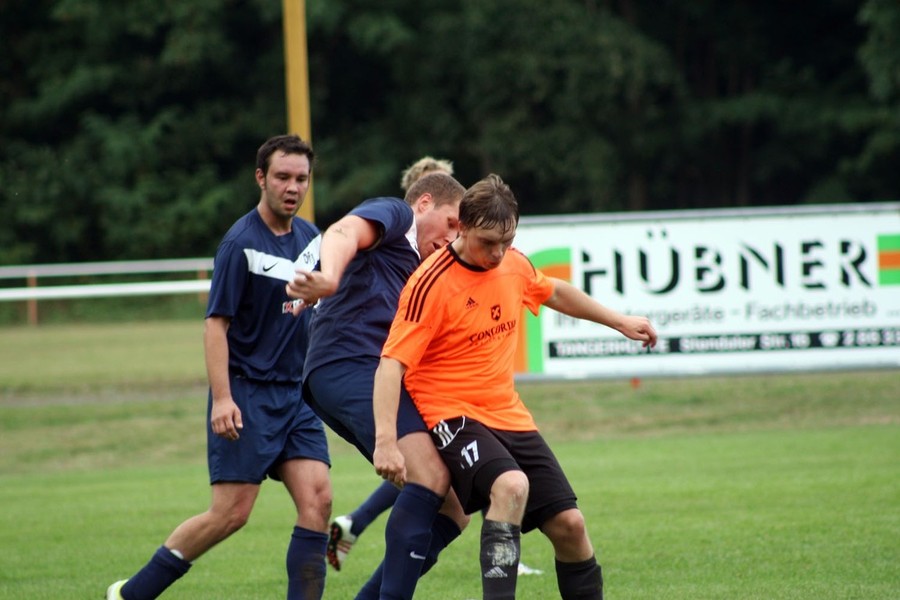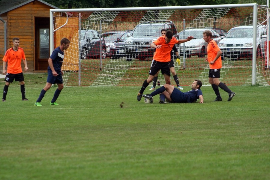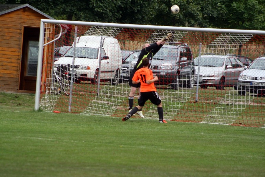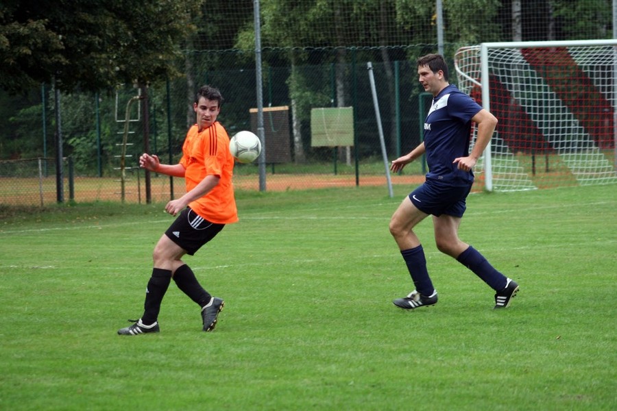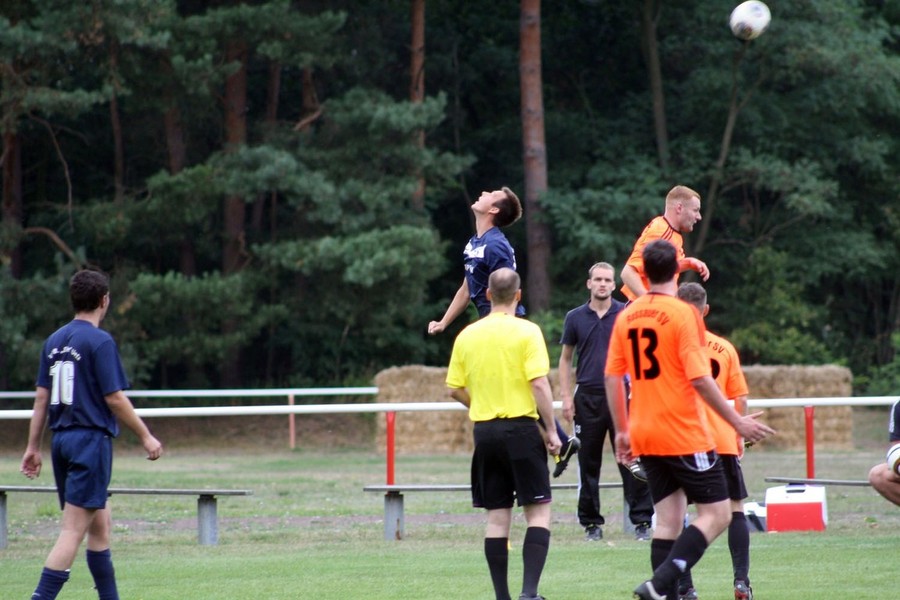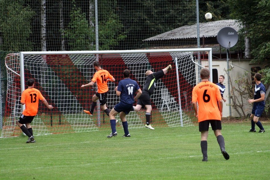 Zum zweiten Durchgang kehrten die Gäste wie ausgewechselt zurück auf den Rasen. Drei Eckbälle und ein starkes Solo von Neuzugang Robert Vorlopp, dessen Querpass Christian Feger nur knapp verfehlte, sorgten für erste Torraumszenen. Ein Gegentreffer lag in der Luft und in der 53. Spielminute war es dann tatsächlich so weit. Marcel Böters und Torsten Lotsch konnten das Zuspiel im Strafraum nicht verhindern und Marcus Hedermann vollendete aus spitzem Winkel. Die Gäste drängten danach auf den Ausgleich und unsere Elf hatte große Probleme zurück ins Spiel zu finden. Mit Glück und Geschick überstanden unsere Jungs aber die Drangperiode der Schulze-Elf und erspielten sich selber wieder Möglichkeiten. Ein Heber von David Mielke und ein Woop-Schuss aus spitzem Winkel blieben allerdings ohne Erfolg. Mitte der zweiten Hälfte entwickelte sich ein offener Schlagabtausch. Rossau spielte mutig nach vorn und unsere Jungs konterten immer wieder gefährlich. So setzte David Mielke eine Pfeiffer-Flanke von der rechten Seite knapp neben den kurzen Pfosten (72.).