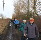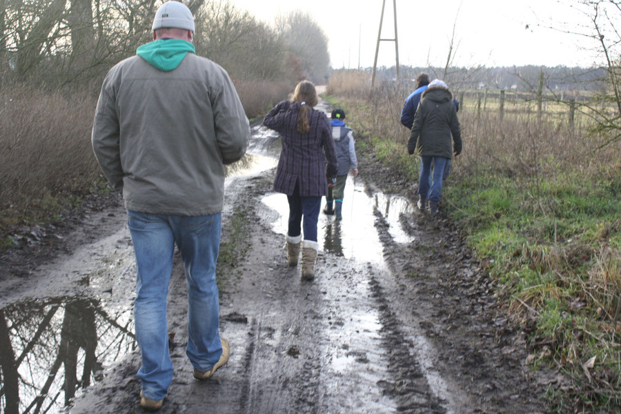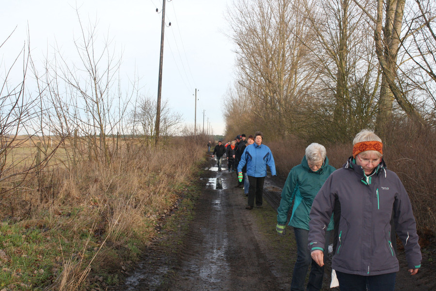 Wanderfreunde im Alter von 2 bis 82 Jahren hatten sich am Dorfgemeinschaftshaus eingefunden und starteten pünktlich die Sonnemannstraße entlang in Richtung Kehnert. Zwar fehlten zu einer „richtigen“ Winterwanderung die winterlichen Temperaturen und an Stelle von Schnee und Eis bekamen es die Wanderer mit einem aufgeweichten Feldweg und zahlreichen Pfützen zu tun. Aber diese kleinen Hindernisse konnte der guten Stimmung an diesem Nachmittag nichts anhaben.