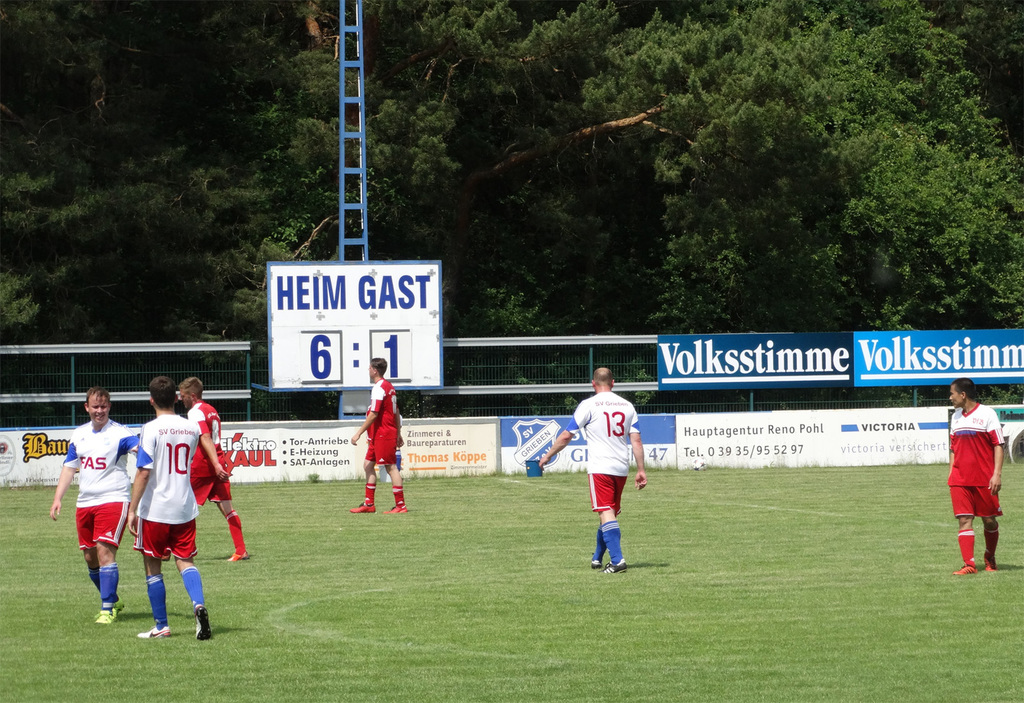 Nichts zu holen gab es für unseren VfB am Samstag beim Derby in Grieben. Wie schon im Hinspiel (1:5) war unsere Mannschaft gegen zielstrebige Griebener chancenlos und verlor deutlich mit 1:6. Den Ehrentreffer für die im zweiten Durchgang dezimierte VfB-Elf erzielte Benjamin Müller per Kopf.