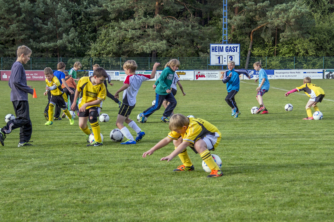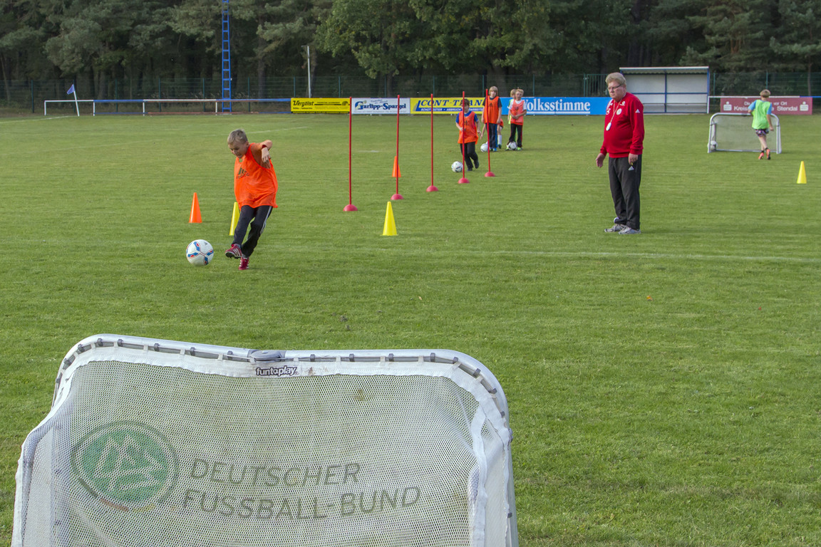 Am vergangenen Freitag machte das DFB-Mobil Station auf dem Griebener Sportplatz. Nachdem das beliebte Trainingsprogramm des Deutschen Fußballbundes im Winter den Fußball-Nachwuchs in der Uetzer Sporthalle begeistern konnte, gab es nun einige Einheiten auf dem Rasen. Knapp 20 Kinder aus der E- und D-Jugend unserer beiden Vereine hatten sich zum gemeinsamen Training eingefunden. Aufmerksam verfolgten sie die Erklärungen der erfahrenen DFB-Trainer Uwe Pape und Jörg Ohm. Im Anschluss kamen unsere kleinen Fußballer beim Passen, Dribbeln und Schiessen gehörig ins Schwitzen. Zum Glück hatten die Muttis der D-Junioren für ausreichende Erfrischungen gesorgt. Für die anwesenden Eltern und Zuschauer gab es außerdem reichhaltiges Angebot an Kaffee und Kuchen. Zum Abschluss des Trainings ging es beim beliebten „Champions-League-Turnier“ noch einmal ordentlich zur Sache. Danach war dann bei allen Teilnehmern die Luft raus und die Kinder verfolgten aufmerksam dem Info-Film über die Arbeit des Deutschen-Fußball-Bundes.